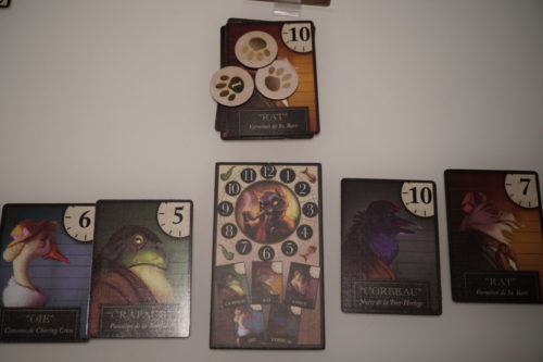 Si on devine bien l’animal ou l’heure, on reçoit un jeton PV dont la valeur oscille entre 1 et 3. Si on devine bien les 2, on reçoit 2 jetons PVs. On reçoit alors une nouvelle carte suspect et on tire 2 nouvelles cartes.