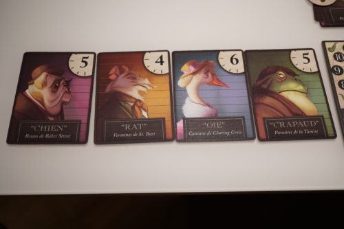 Comme il est généralement très difficile de trouver l’heure, on va bien souvent se concentrer sur la découverte de l’animal ce qui, avec un brin de chance, peut quasi être découvert à chaque tour de jeu. Ca donne un petit côté répétitif au jeu car on découvre à chaque tour puis on met une nouveau suspect en place pour le découvrir au tour d’après.