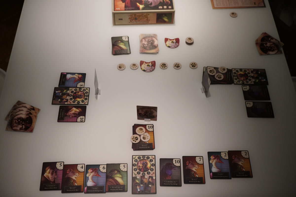 Tout cela est couplé à un système semi coopératif grâce au chat. A chaque tour, le chat va avancer d’une case vers la sortie. Plus vite les joueurs découvriront leur suspect et l’heure du crime, plus vite ils pourront attraper le chat. Mais s’ils trainent à découvrir les coupables, ce qui sera bien souvent le cas s’ils ne prennent pas un peu de risque, le chat arrivera à s’enfuir et tous les joueurs perdront. Le joueur avec le moins de PVs perdra plus que les autres mais personne ne gagnera.