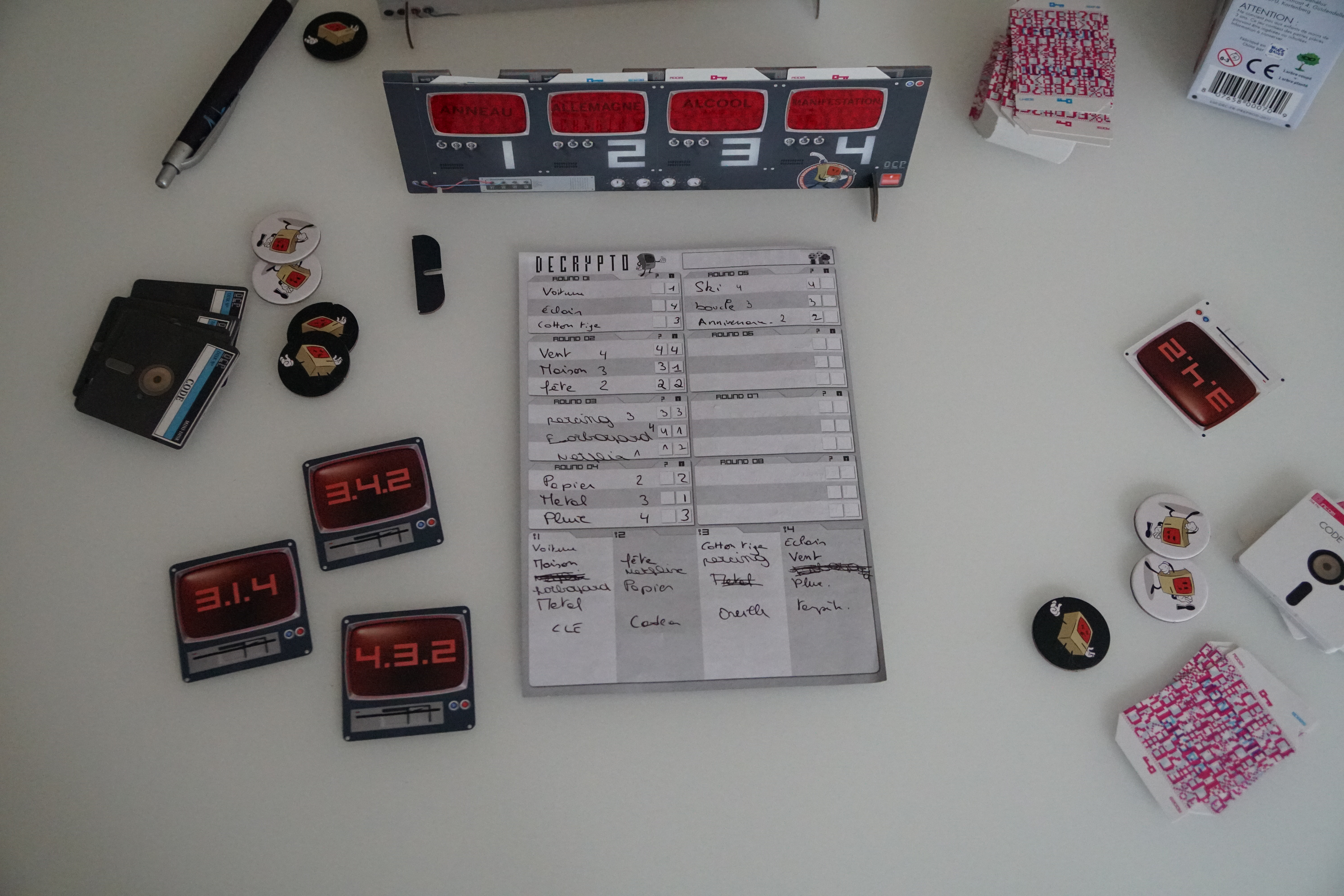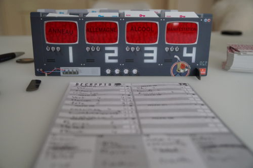 Exemple: la décrypteuse dit « apéritif » – « Australie » et « révolution ». Vous aurez deviné que le code était cette fois 2-1-4. Mais avant que les membres de votre équipe ne devinent le code, l’équipe adverse peut faire une proposition. Ils ont auparavant déjà noté les indices donnés. Quand ils entendent « apéritif », ils peuvent se dire que c’est lié à « fête » et tentent le « 2 ». « révolution » et « grêve » allant ensemble, ils peuvent se douter qu’il s’agit du « 4 ». Pour « voisin » et « Australie », ils auront plus de mal par contre…