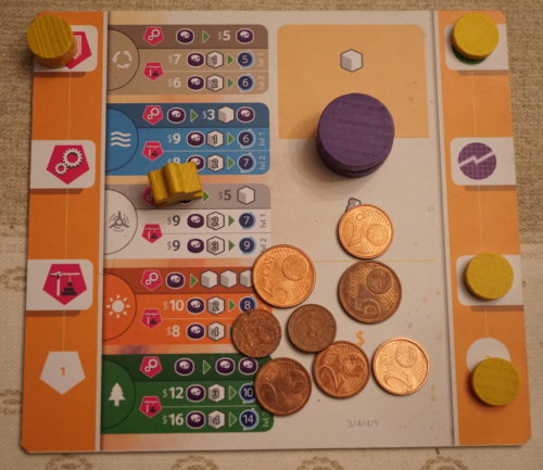 Et il faut bien admettre que ce n’est pas facile. Chaque joueuse dispose, dès le début de la partie, d’une carte objectif qu’elle voudrait bien réaliser tout en optimisant ses coups et sa stratégie. Mais axer toute sa stratégie et ses coups dans l’idée de réaliser sa carte objectif et de se construire une mécanique d’optimisation de ses revenus est vouée à l’échec car, c’est bien simple, à 3 joueurs, si les joueurs veulent survivre, ils doivent construire 2 centrales « vertes » par personne avant le début du troisième tour et continuer leurs efforts le tour suivant pour éviter la catastrophe. Mais comme construire une centrale n’apporte « que » des PVs et aucun autre bonus comme l’augmentation essentielle des revenus, les joueurs rechignent à construire des centrales si tôt dans la partie. Il y a un vrai sentiment de sacrifice pour atteindre l’objectif mondial de contingence du CO2. De plus, pour y arriver, vous serez bien souvent amené à sacrifier votre carte objectif en la vendant pour $8. Et sacrifier sa carte objectif alors que d’autres vont la conserver gentiment pour profiter de ses PVs en fin de partie peut être très frustrant.