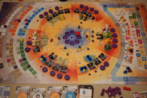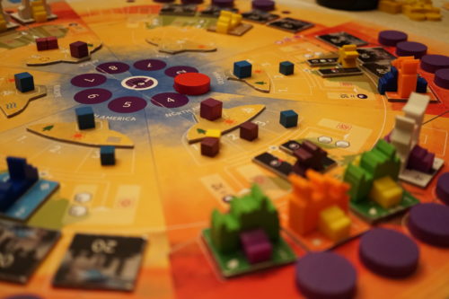 Même pour cette action relativement simple, les choix ne sont pas simples car on peut également déplacer un scientifique sur un congrès permettant de gagner plus de connaissance mais nécessitant une bonne coordination entre joueurs car tant qu’un congrès n’est pas rempli, les scientifiques ne pourront pas le quitter.