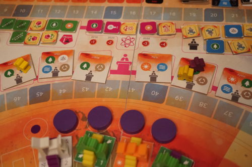 A son tour la joueuse peut également réaliser 3 actions facultatives: déplacer un scientifique, jouer une carte lobby ou réclamer un objectif de l’ONU, aller au marché pour acheter ou vendre un certificat d’émission. Chacune des actions facultatives ne peut être réalisée qu’une fois (donc 3 actions facultatives maximum, mais une de chaque maximum). Déplacer son scientifique permet de gagner des points de connaissance, et donc avancer sur les différentes pistes de connaissance, ce qui donnera des bonus et génèrera des revenus ou des points de victoire. Jouer une carte lobby permet d’avoir des bonus. Réclamer un objectif de l’ONU (grâce aux infrastructures qu’on a construites) donnera des points de victoire à la fin). Et aller au marché permettra soit de gagner de l’argent quand on en a besoin en vendant un certificat, soit au contraire d’acheter un certificat dont on a besoin pour réaliser une des étapes de construction de la centrale.