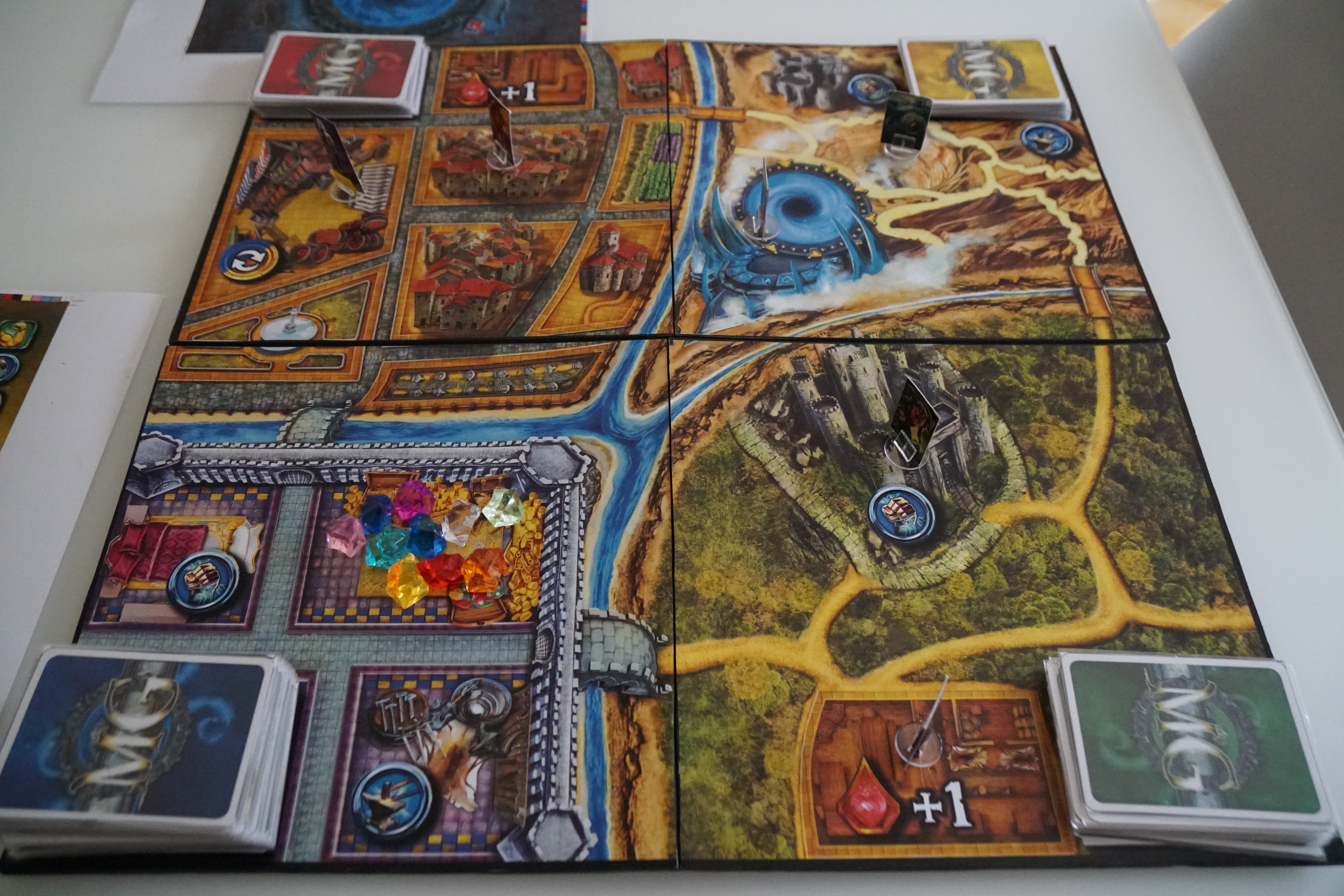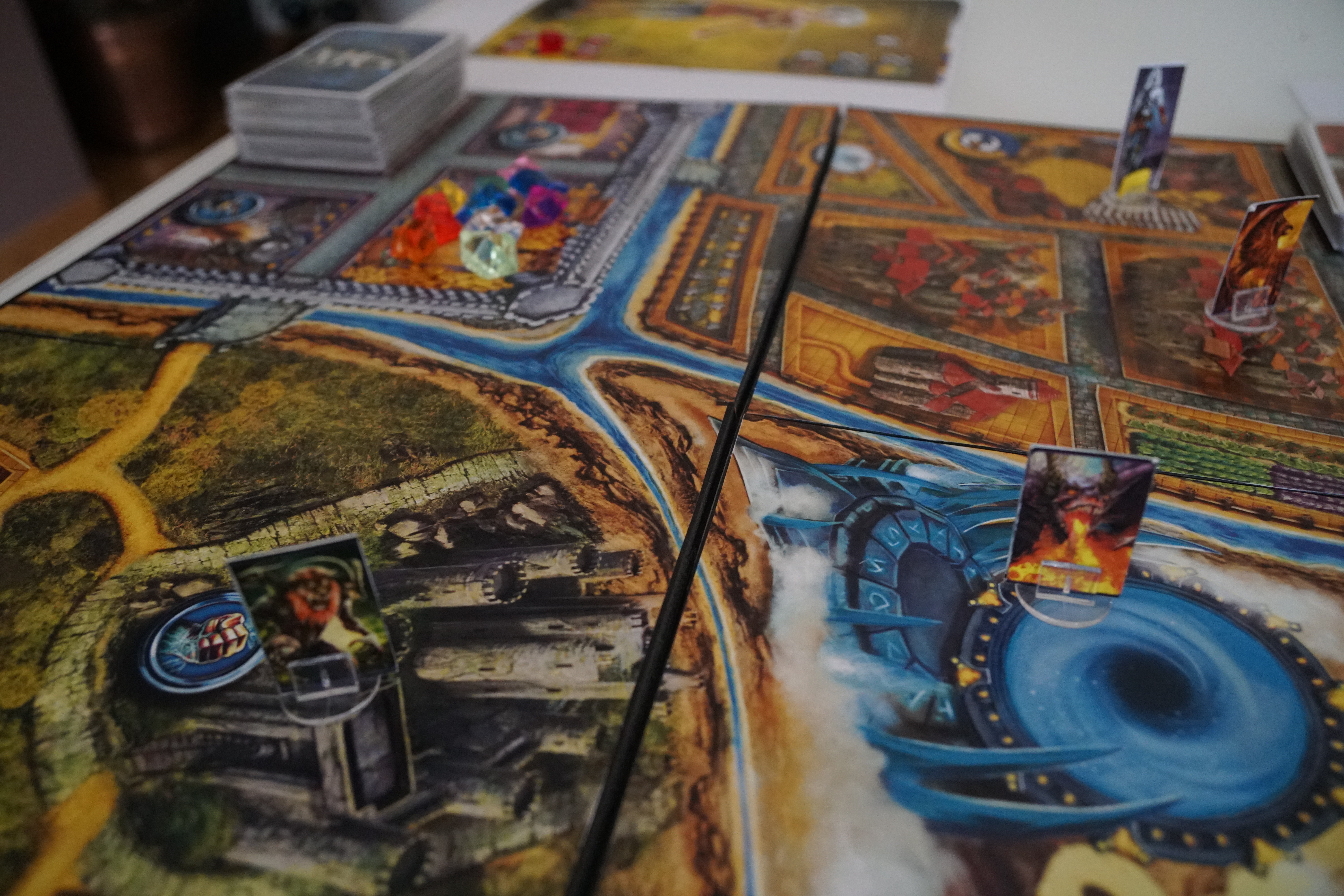 Mythsgate est un jeu d’aventure de composition assez classique. Ca fait néanmoins du bien de découvrir un système de combat différent des sempiternels jets de dés. De plus, la mécanique de combat via les cartes est vraiment bien faite même si le hasard est omniprésent dans le jeu. La tension y est bien présente grâce au système d’objectif de victoire. Mythsgate est une sorte de course poursuite entre les 2 camps, l’un visant à récolter 10 gemmes et l’autre à tuer 10 monstres avant que l’autre camp n’atteigne son objectif. Les joueurs sont constamment plongés dans cette course poursuite ce qui les aide à s’immerger encore plus dans le thème fantastique. On se laisserait bien plonger dans ce gouffre mythique une nouvelle fois!