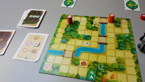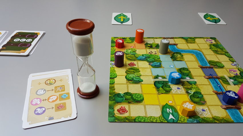 20180506_115227Ces apprentissages, par 3 ou 4 au verso, vont enseigner aux enfants le jeu étape par étape. Ainsi, on ne sera pas obligé de se taire, de ne pas faire de signes ou d’utiliser le temps dès le départ.  Tout simplement parce que ce sont les difficultés principales pour les enfants, mais aussi, pour qu’un adulte puisse éventuellement les aider à jouer ! On commencera léger avec le déplacement d’un seul pion, puis pour se rencontrer, passer des obstacles, utiliser les pouvoirs des personnages (certains peuvent traverser une rivière, se téléporter, etc…), et enfin dans les derniers tutoriaux on ajoutera la notion de temps avec le sablier. Du coup, le pion en bois que les enfants adorent tant à claquer sur la table n’est plus présent au grand bonheur des tympans adultes 😀