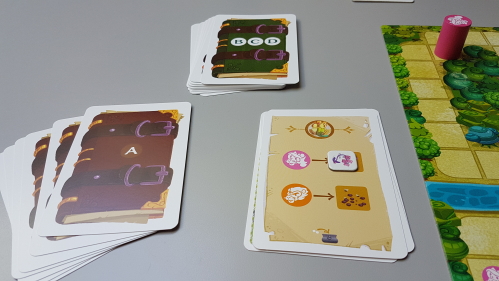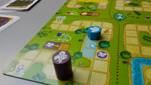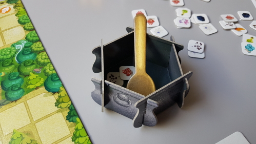 20180506_115010Comme je parle d’ingrédients, les objectifs vont également changer. En effet, cette fois l’histoire raconte qu’un roi a été transformé en crapaud, et les joueurs vont devoir récolter des ingrédients pour lui redonner son apparence. Les ingrédients seront des petits jetons que l’on prendra dans la pioche en déplaçant des personnages sur certaines cases et qu’on posera sur 3 cartes objectifs à réaliser, dans un ordre précis. Une fois une carte remplie, on vide alors les jetons dans la marmite, jusqu’à ce que l’on voit la carte du crapaud. Exit, le scénario du « vol » dans un supermarché. Cette fois, on part sur une histoire plus classique, mais plus adaptée aux enfants.