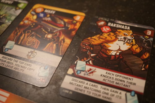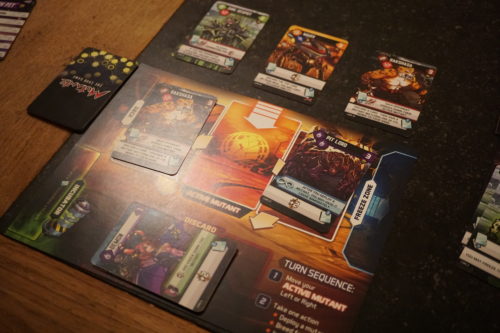 Il faut néanmoins préciser qu’un deck ne comprend que 12 cartes dont chacune est en double exemplaire (6 cartes uniques en 2 exemplaires). Voilà une construction ou un draft beaucoup plus simple que pour les 60 cartes d’un deck de Magic ! Un peu comme dans Vikings Gone Wild, Mutants propose une certaine simplification des mécaniques tout en maintenant une belle profondeur.