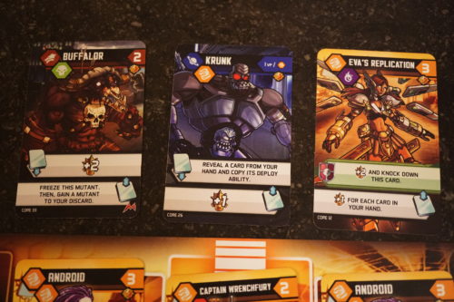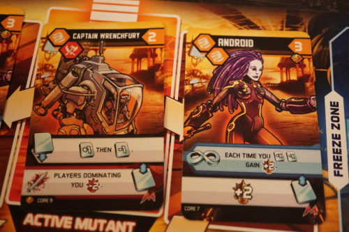 Il faut dire que les 2 ont un même illustrateur en commun ce qui aide à garder une certaine cohésion. De plus, ils proposent tous deux une mécanique de deckbuilding. Mais, alors que dans Vikings Gone Wild on acquière les cartes en payant leur coût avec d’autres cartes, dans Mutants on les acquière de multiples façons…