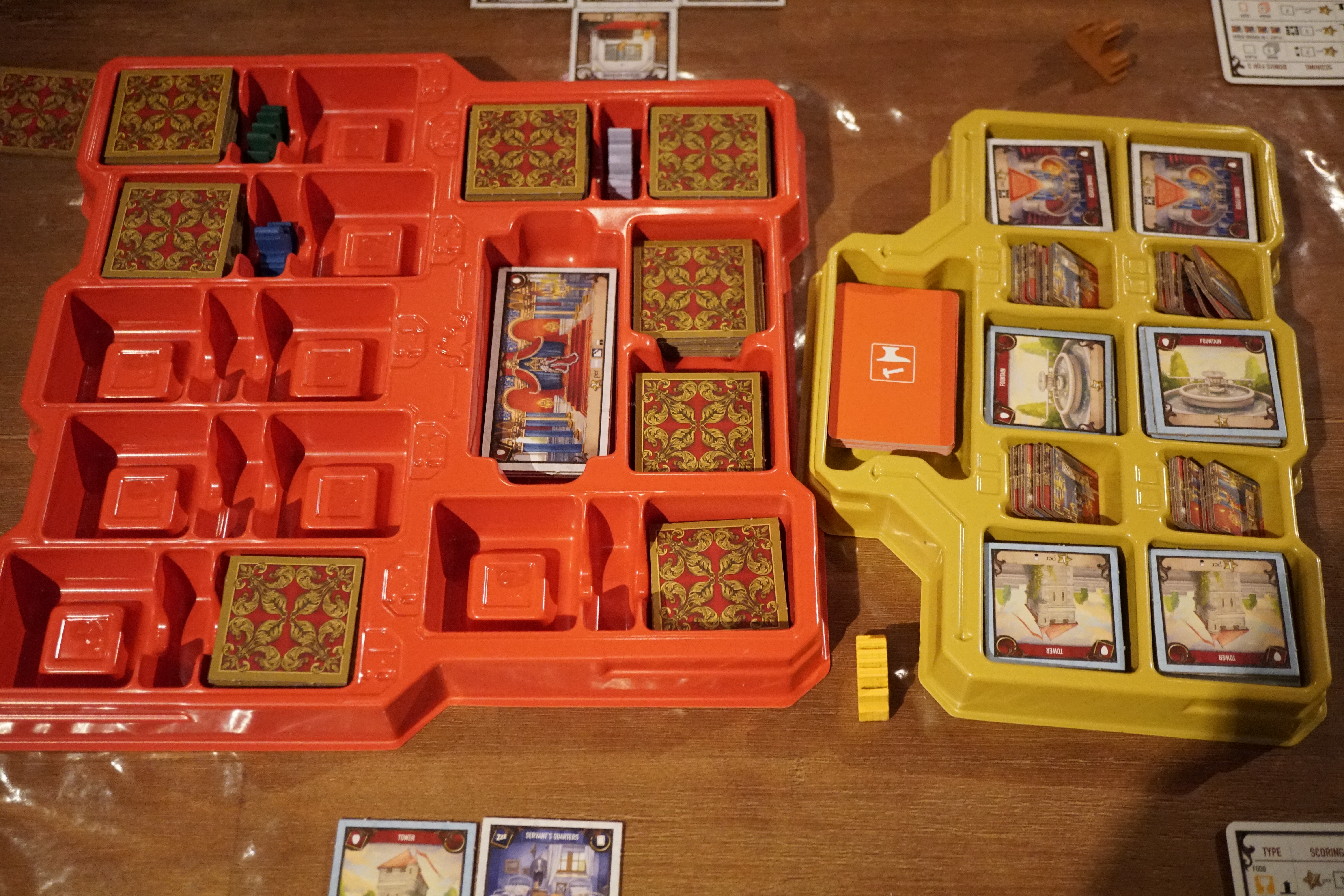 Between 2 Castles est original, principalement parce que vous devez coopérer avec vos voisins pour la construction de vos 2 chateaux. On discute donc beaucoup autour de la table, on optimise, on calcule, on surveille un petit peu que nos voisins n’avantagent par trop leur second château … Tout cela donne une ambiance très sympa. Et je ne me souviens pas avoir jouer à un autre jeu qui donne lieu à ces échanges.