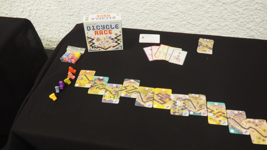 Dicycle Race, un jeu de dés dans le genre du Yatzee où le hasard est bien présent mais présenté ici sous le couvert d’une course cycliste. L’originalité réside dans le choix des dés au début de son tour. J’y reviendrai plus en détail plus tard.