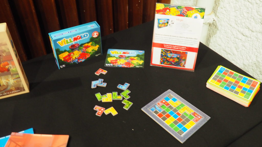 J’ai un peu raté la photo ici. Villageo est un jeu en solitaire. Les grilles comportent des cases colorées sur lesquelles il faut placer des pièces polyomino de même couleur. Par contre, libre choix sur les cases grises. Le but est de remplir le petit plateau avec toutes les pièces. A droite, toutes les cartes à difficulté croissantes.