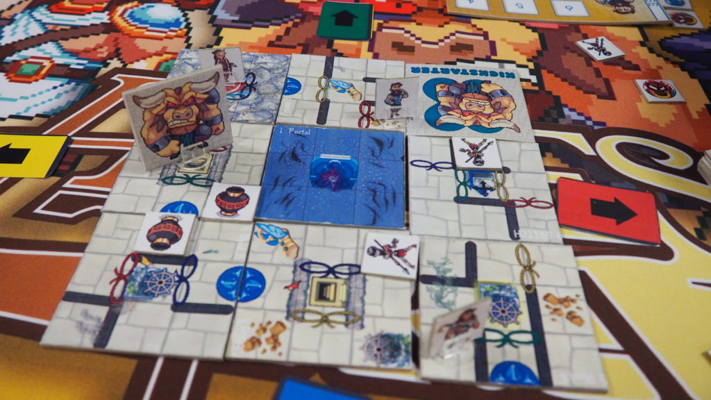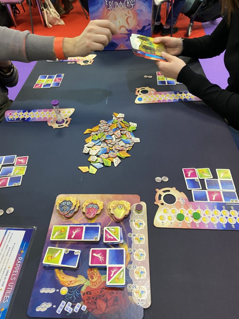 Dream Runners, à paraître chez Ankama, sera sans doute un succès. Rapidement: une carte est placée au centre de la table. elle comprend 9 cases avec divers symboles et couleurs. Les joueurs composent ensuite un carré de 3×3 avec les tuiles polyomino qu’ils possèdent en essayant d’éviter les cases « pièges » et de correspondre les cases octroyant un bonus (ressources, pouvoir, etc.). On a eu droit à une explication mais je n’ai pas eu le temps d’y jouer, malheureusement!