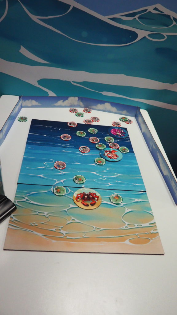 Fish n’ Chips, un jeu d’adresse à venir, chez Studio H. Deux équipes s’affrontent à la pèche. Le but est d’être majoritaire, par zone et par proie. Un total de 6 points est donc à distribuer entre les deux équipes.