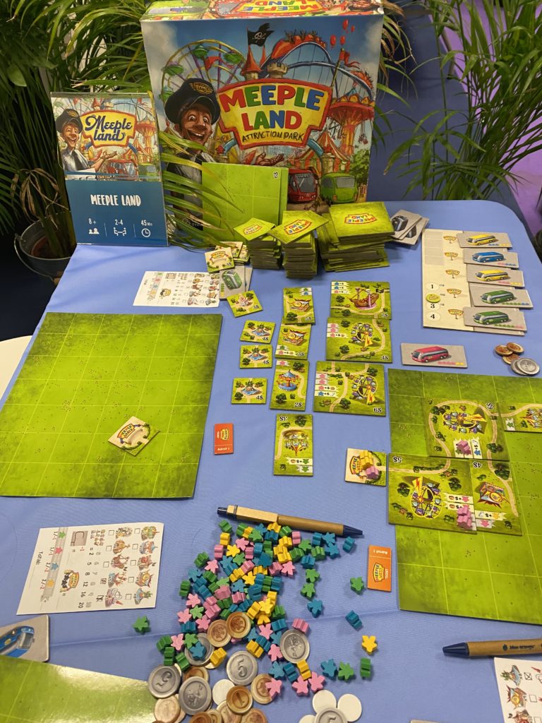Meeple Land, chez Blue Orange, où les joueurs développent un parc d’attraction pour accueillir des clients. Et les clients arrivent en bus. En proto au FIJ et à tenir à l’oeil!