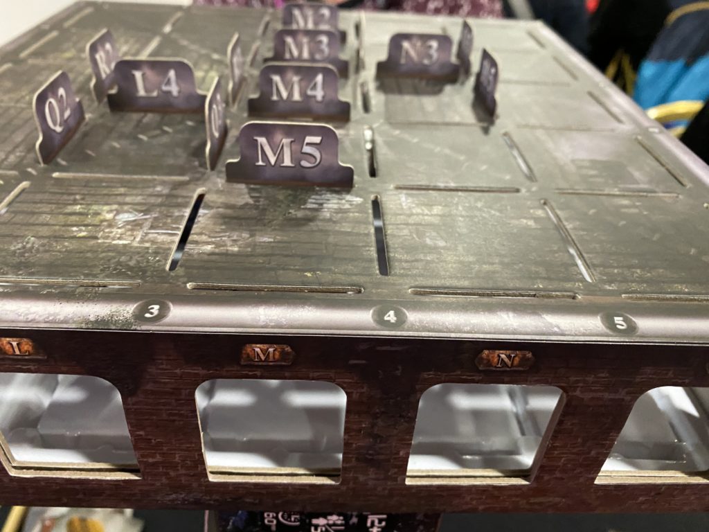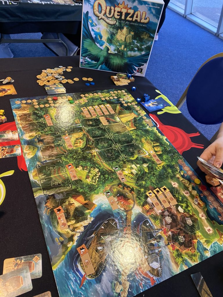 Encore un proto chez Gigamic. Quetzal est un jeu de placement d’ouvriers. Les meeples, les joueurs les lancent en début de manche et le côté sur lequel ils tombent indique leur couleur: noir ou blanc. et s’ils tombent sur le côté, le joueur a le choix. Et s’ils retombent debout, le joueur gagne une pièce. Lors du placement, un joueur peut surenchérir le lieu choisit en plaçant plus de meeples (comme dans Lancaster), à condition d’être de la même couleur. J’ai eu l’occasion de faire quelques tours et Quetzal est bien plaisant et tendu (uniquement 5 manches, ce qui exige de faire des choix)