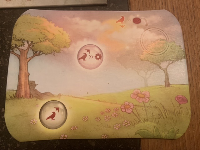 Votre tuile tourment a elle aussi quelques caractéristiques intéressantes… Tout d’abord elle offre elle aussi la possibilité d’attirer (ou de faire bouger) la corneille rouge (seulement après avoir utilisé le pouvoir de votre carte cauchemar). Ensuite elle est double face. La face de départ est la face tourmentée. Une fois que vous réalisez la carte cauchemar, vous avez 2 possibilités: soit vous êtes contents d’avoir vaincu votre cauchemar, et vous vous en débarrassez. Vous défaussez la carte, et la tuile tourment reste sur la face tourmentée jusqu’à la fin de la partie. Et à chaque tour vous pouvez utiliser directement son pouvoir. Mais une petite ombre plane encore sur votre sommeil… Soit vous décidez de vous débarrasser définitivement votre cauchemar. Vous retournez alors la carte cauchemar… pour voir apparaître un cauchemar +++! Mais le jeu en vaut la chandelle, car une fois que vous le complétez 2 choses arrivent: de 1 vous gagnez les points du cauchemar (et c’est une « grosse » carte). Et de 2, après avoir défaussé le cauchemar, vous retournez la tuile tourment sur sa face apaisée. Et là c’est le bonheur! Un paysage de félicité s’offre à vous. Et surtout deux emplacements pour placer des fragments (sur l’un des deux vous pourrez placer des fragments cauchemar) et bénéficier de pouvoirs puissants: déplacer la corneille rouge pour l’un. Déplacer la corneille rouge ET bénéficier de n’importe quel pouvoir du monde des rêves pour l’autre. Cela va ouvrir la porte à toutes le fenêtres… heu pardon ça va ouvrir la porte à un festival de combos d’enfer (normal pour un cauchemar). Pour peu que vous ayez 2 ou 3 rêves en cours et la tuile tourment sur sa face apaisée vous allez pouvoir vous en donner à coeur joie pour réaliser vos rêves les plus fous!