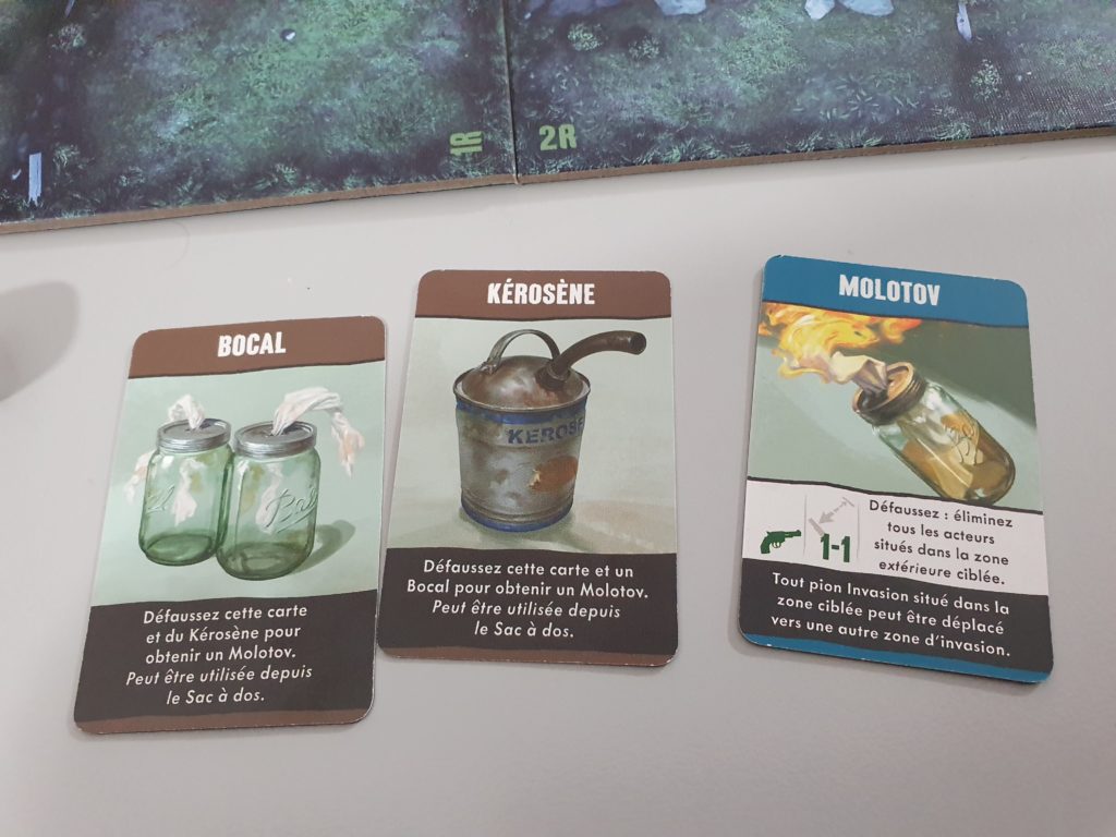 Dans le jeu, vous pourrez fabriquer ces cocktails aussi. Mais si vous le balancez dans une zone d’apparition de Zombies, vous pourrez aussi la déplacer vers une autre zone ! Un changement de règles important, qui sera même nécessaire à réaliser dans certains scénarios ! Attention toutefois, il faudra toujours révéler des apparitions de morts-vivants autant de fois que de jetons.