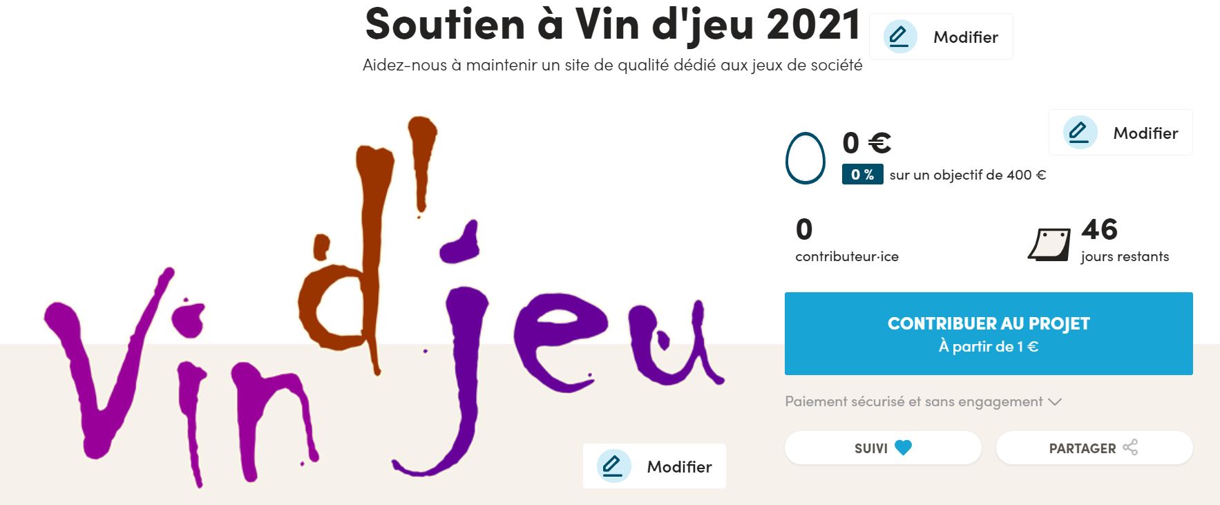 Salut à vous, Suite à la campagne Ulule de soutien à Vin d’jeu 2021, un tirage au sort parmi les contributrices et contributeurs va être organisé le lundi 26 Avril. Pour cela, j’ai besoin que chaque contributrices et teurs m’envoient leurs souhaits. J’ai envoyé un rappel sur Ulule mais pour...
