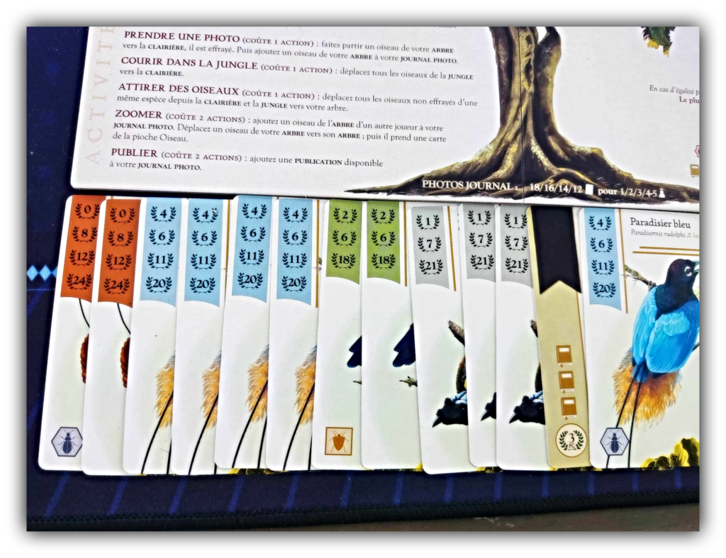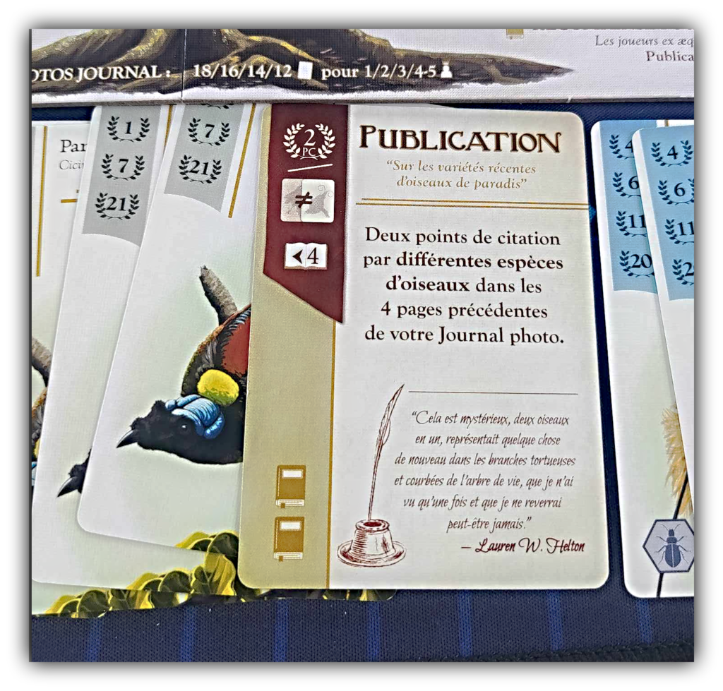 Ainsi les paradisiers bleus ci contre, rapportent jusqu’à 20 pts de citation au joueur en ayant une série contiguë de 4 cartes, le jeu en contient 12.