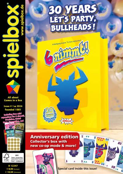 Et à son sommaire on pourra lire: add-ons:Promo for « Kutná Hora » (Czech Games)« Marchland » promo for « Dominion » (Rio Grande)A special card for « 6 nimmt! » (Amigo Games)Lucky Coins for « Challengers » (Plan B)Promo for « Evacuation » (Delicious Games) COVER STORYThe Bull Has Aa Big Birthday; Take 5! (6 nimmt!) REVIEWSThe Aestetics of the Machine: The White CastleIt’s...