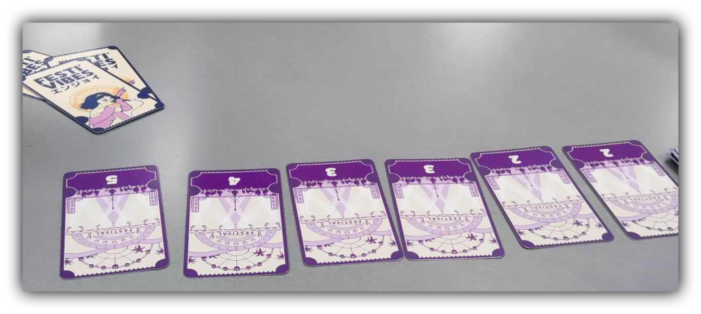 Les six cartes festivals sont positionnées au centre du jeu , sur ces dernières un chiffre (allant de 2 à 5) indique combien de cartes évènements au maximum peuvent être placées sous chacun de ceux-ci.
