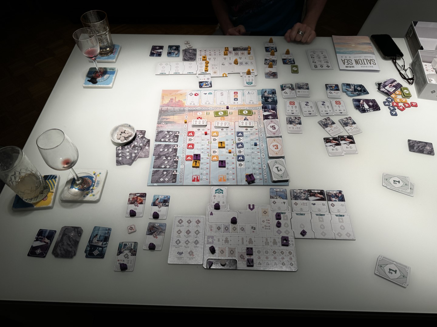 Salton Sea est un jeu qui peut frustrer. Certaines cartes peuvent sembler trop puissantes et la gestion de l’argent est très tendue voire trop tendue pour certains joueurs. La progression est lente et tout est sacrifice et tension. Le jeu, malgré ça, séduit principalement grâce à cette mécanique très originale qui tourne très bien de cartes multiusage : dollars ou action. Il va demander du temps à être apprivoisé tant il propose une belle marge de progression. Sa gestion tendue empêche les joueuses de tout faire dans le jeu et leurs donnent l’envie d’y revenir pour essayer d’autres choses. Ajoutez à ça des objectifs de partie qui peuvent varier et vous obtenez un très bon euro qui sort des sentiers battus grâce à ses mécaniques originales et ses sensations ludiques différentes.