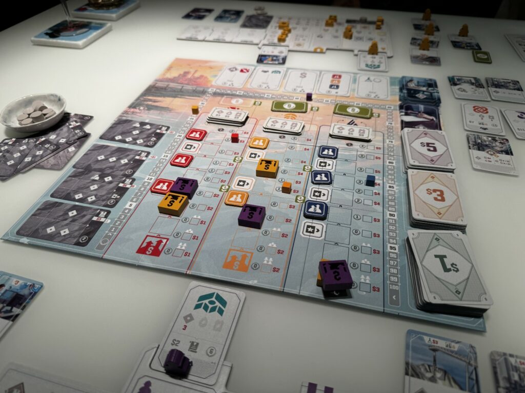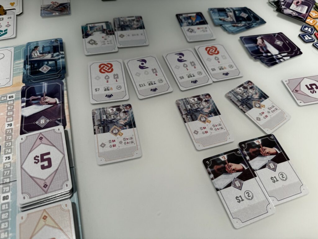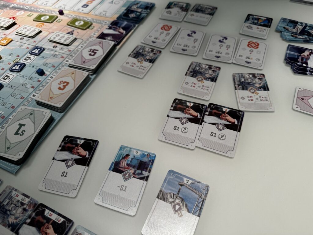 Le jeu est très très tendu! Exploiter coûte en effet de l’argent. Il faut donc tout le temps vendre pour avoir de la liquidité pour exploiter encore, puis enfin transformer. L’argent est donc hyper important. Et sa gestion est … excellente. L’argent est représenté par des cartes. Seulement, comme on retrouve cela dans d’autre jeux, elles offrent aussi des actions généralement plus puissantes que celles de base de notre plateau. On est donc toujours occupé à évaluer s’il faut garder une carte ou l’utiliser pour payer. Sachant, je le répète, que le jeu est hyper tendu à cause de l’argent. Et aussi que les cartes valant 5$ offrent souvent une plus grande réduction que carte de 3$ ou 1$.