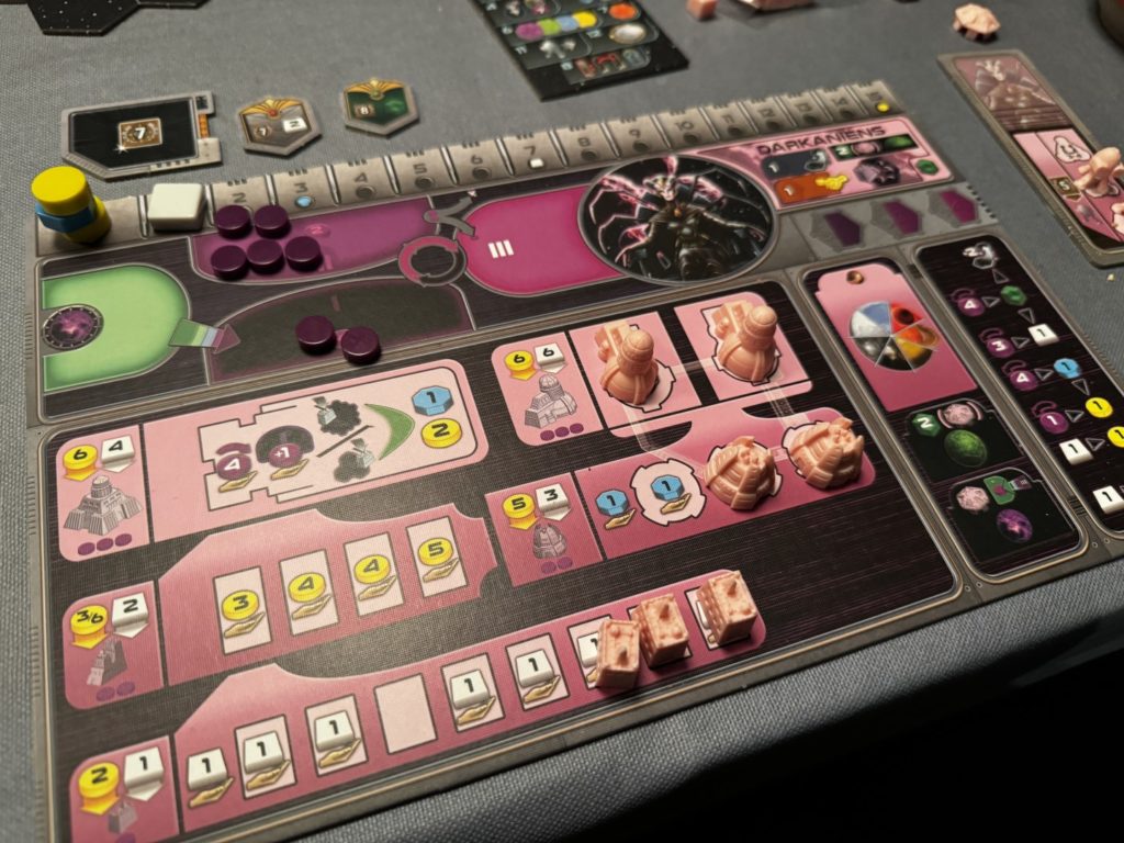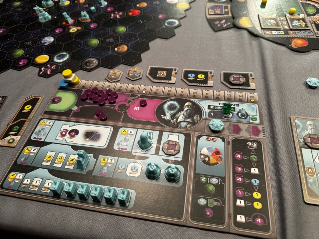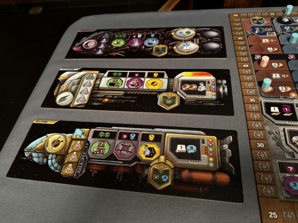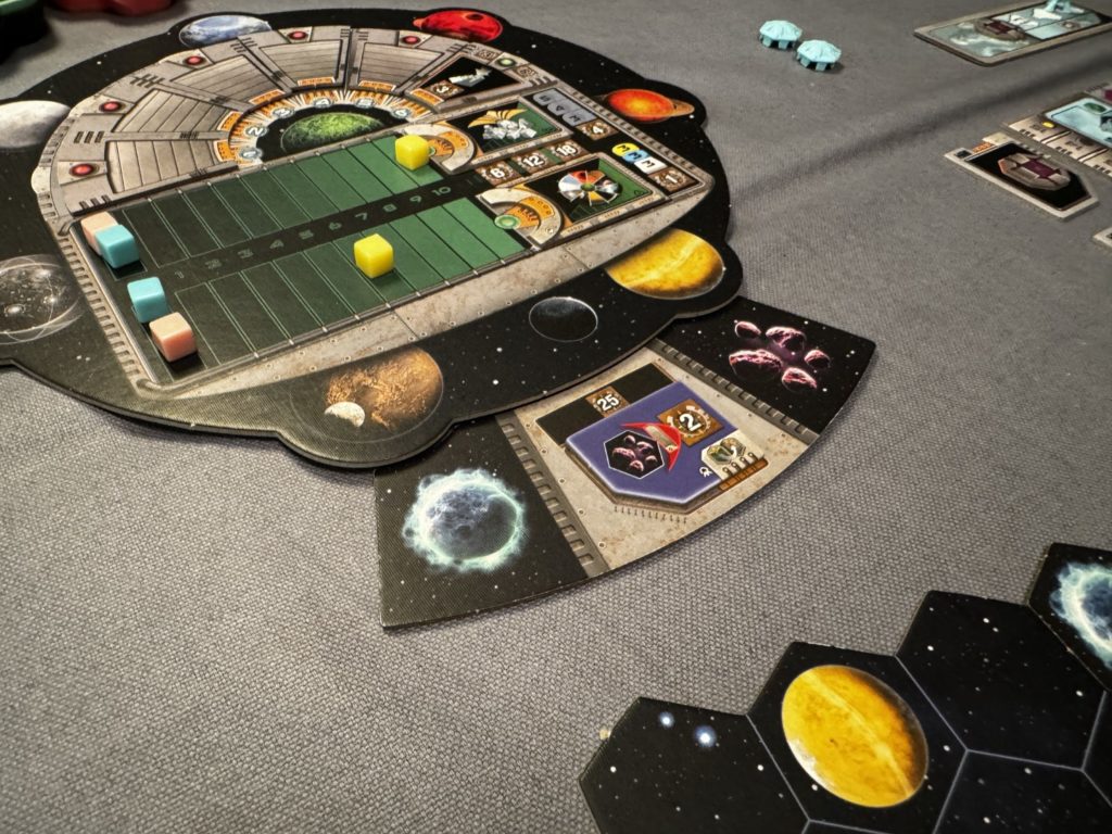 La première ajoute, sur la carte, 4 vaisseaux perdus (on aurait aimé des petites figurines pour les représenter mais une tuile suffira 😉). Chaque faction possède désormais 3 petits vaisseaux permettant de les aborder au prix de 5 PVs en général (mieux vaut dès lors les aborder en début de partie pour en profiter un max plutôt qu’en fin de partie où le coût de 5 PVs sera rédhibitoire). Aborder un vaisseau donne droit à pas mal de privilèges : on a accès à de nouvelles technologies, un nouveau jeton alliance et à de nouvelles cases action de puissance. Toutes ces nouvelles options sont évidemment plus efficaces et intéressantes que celles disponibles ailleurs sur le plateau. Les nouvelles cases actions sont cependant les plus disruptives car elles proposent non seulement des cases action de puissance très intéressantes mais également des cases actions permettant de dépenser des CIQ, de la science et même de l’argent. Si vous vous construisez une stratégie vous permettant de récolter plus de CIQ, d’argent ou de science qu’il n’en faut, ces cases deviendront très lucratives. Même si leur intérêt s’estompe en cours de partie, ces flottes vous apporteront donc de nouveaux choix et de nouvelles possibilités stratégiques.
