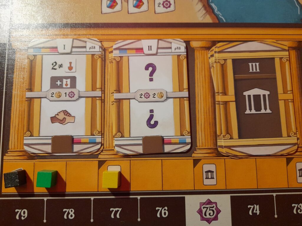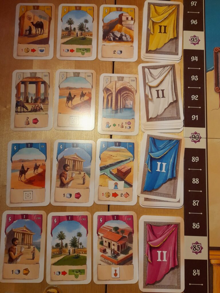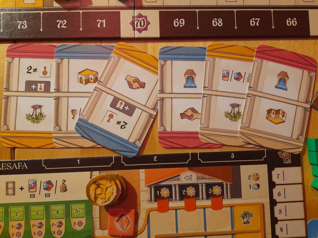 Pour le reste, heureusement, Resafa, coche toutes les cases des bons eurogames principalement grâce aux 4 échelles colorées. L’une permet de gagner des cartes action qui remplacent vos cartes action en les rendant plus puissantes, l’autre apporte des capacités permanentes, la troisième de gros bonus occasionnels (souvent le droit de réaliser une ou deux actions) et la dernière des PVs bonus en fin de partie. Enfin, à la place de grimper sur une échelle, les joueurs peuvent toujours gagner le bénéfice immédiat d’une des cartes du présentoir qui offre des opportunités tactiques souvent intéressantes.