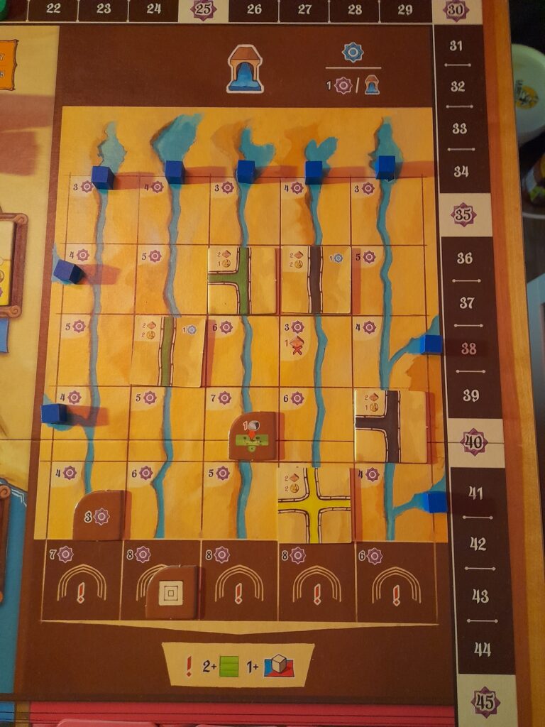 La 5ème action correspond à la construction de canaux pour stocker l’eau. Au début de la partie les joueurs disposent de 7 tuiles pouvant être placées sur le plateau pour former des réseaux de canaux. Elles ne sont pas toutes identiques et leurs coûts sont variables en fonction des gains potentiels qu’elles vont apporter. Un peu comme dans barrage, la pose de certaines tuiles va entraîner l’écoulement d’eau et permettre aux joueurs qui ont bien construit leurs réseaux de canaux de scorer lors des 3 décomptes intermédiaires après les manches 2, 4 et 6. Cette action est une source de points non négligeable. Elle est donc incontournable et il est vivement conseillé de ne pas la négliger… Le défaut principal du jeu est à mon sens lié à cette action. En effet, un joueur peut rapidement prendre le contrôle des canaux et alors cette action devient très puissante et extrêmement lucrative. Il faut que les joueurs se challengent sinon la partie pourra rapidement être déséquilibrée…
