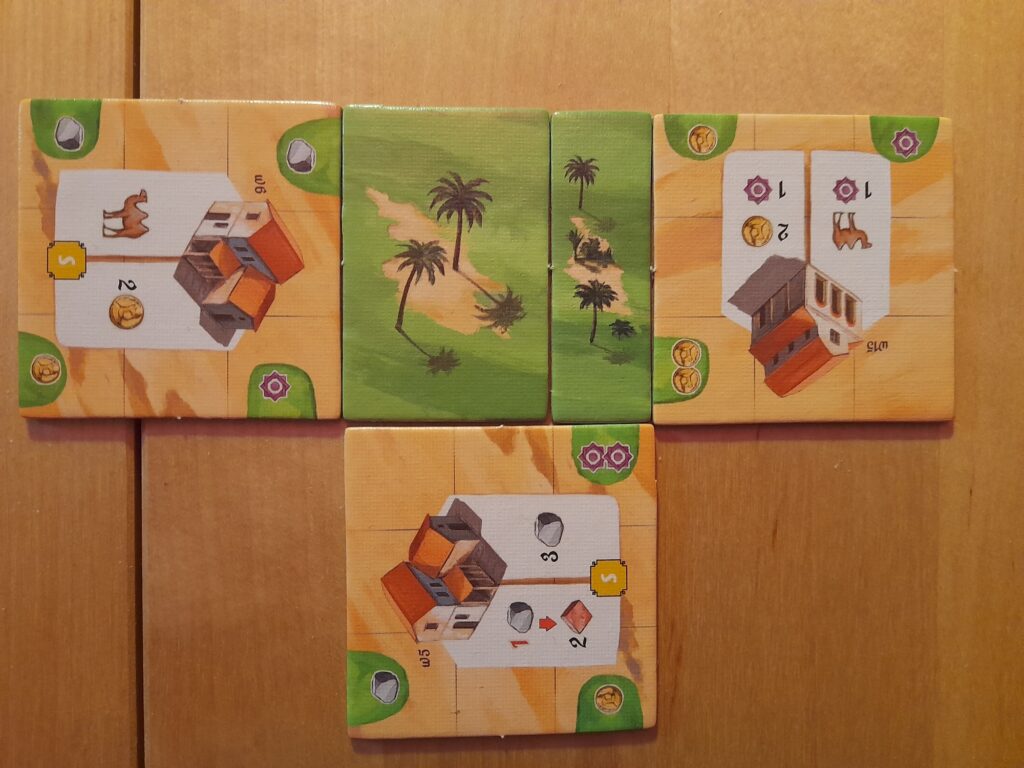 Enfin la 6ème action correspond à l’achat ou la vente de ressources grâce au déplacement de la caravane des joueurs. Cette caravane est matérialisée par un chameau sur le plateau de jeu. La quantité d’une marchandise que le chameau peut transporter dépend d’une piste situé sur le plateau personnel de chaque joueur. Les joueuses/joueurs vont pouvoir la faire progresser au fur-et-à-mesure de la partie pour réaliser des achats et des ventes plus intéressantes. Cette action est également très importante car elle va permettre de gagner pas mal de points en cours de partie. Elle va permettre également aux joueuses/joueurs d’établir des comptoirs dans les villes visitées et de récupérer des jetons marchands qu’ils vont ensuite placés sur leur plateau personnel pour scorer en fin de partie sur les jardins, les ateliers et les canaux.