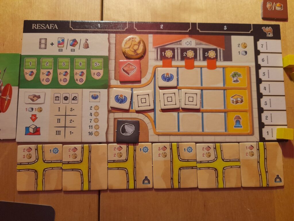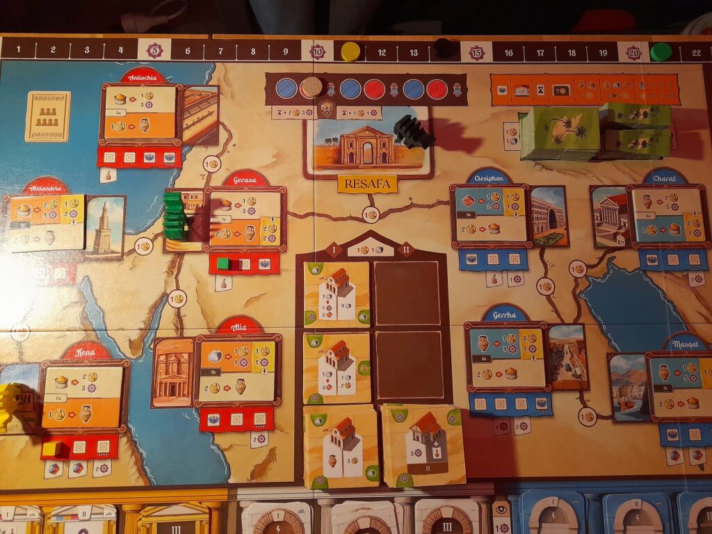 Resafa est une ville antique se situant au Moyen-Orient (en Syrie actuelle plus précisément). Cette ville constitue le point de départ des caravanes de marchands jouées par les joueuses/joueurs qui vont sillonner les villes antiques du Moyen-Orient de l’Égypte à l’Irak pour vendre ou acheter des marchandises et y établir des comptoirs. Outre le développement et le déplacement des caravanes, les joueurs vont également développer la ville de Resafa en construisant des ateliers et des jardins qui vont produire des ressources. Comme l’eau est rare et précieuse à Resafa, les joueurs vont également devoir développer des réseaux de canaux et de réservoir pour stocker l’eau indispensable à la vie. Comme on parle de la thématique du jeu, j’en profite pour dire tout de suite que ce n’est pas un des points forts du jeu. En effet, on a à faire un un thème assez plaqué et hormis la carte on n’a qu’à de rares moments l’impression d’évoluer au Moyen-Orient…
