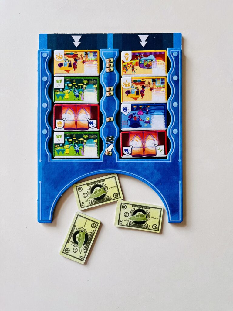 La seconde action est de prendre de l’argent. Pour cela rien de plus simple : on choisit la tuile du bas de l’une des deux colonnes de la rivière que l’on retourne sur sa face Billet. Et voilà le tour est joué, on a de l’argent ! Pour devenir encore plus riche, il faut réaliser cette action quand plusieurs tuiles de même couleur sont présentes dans la colonne car elles permettent de récupérer un billet de la banque pour chaque tuile similaire. L’argent n’a pas un rôle prépondérant dans ce jeu, ce n’est pas la peine de faire son Picsou car il ne sert qu’à payer une tuile Lieu plus haut dans la rivière. Il est parfois utile de payer afin d’obtenir celle dont on a vraiment besoin.