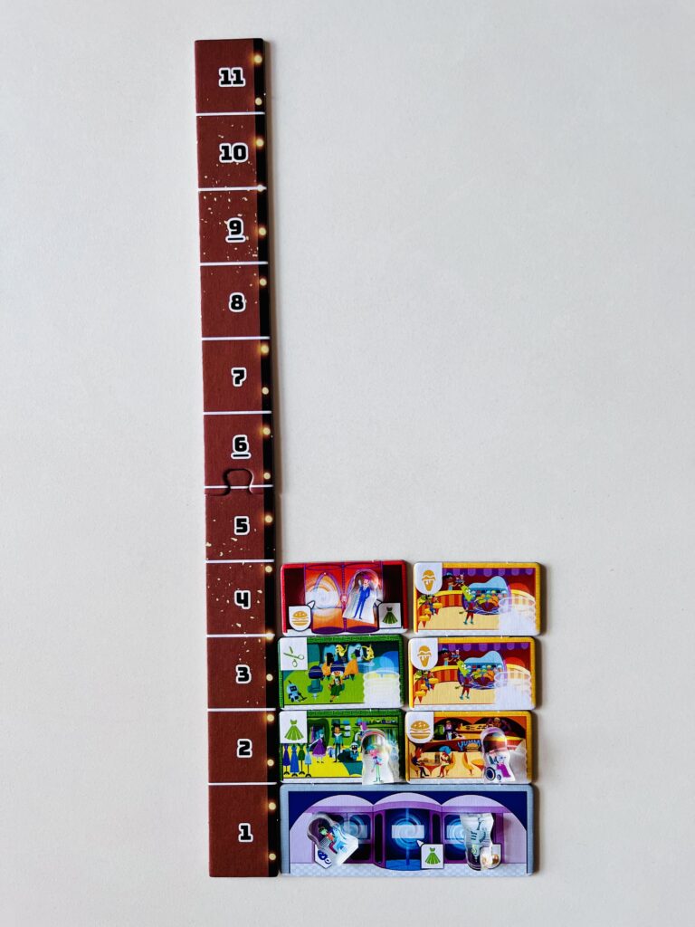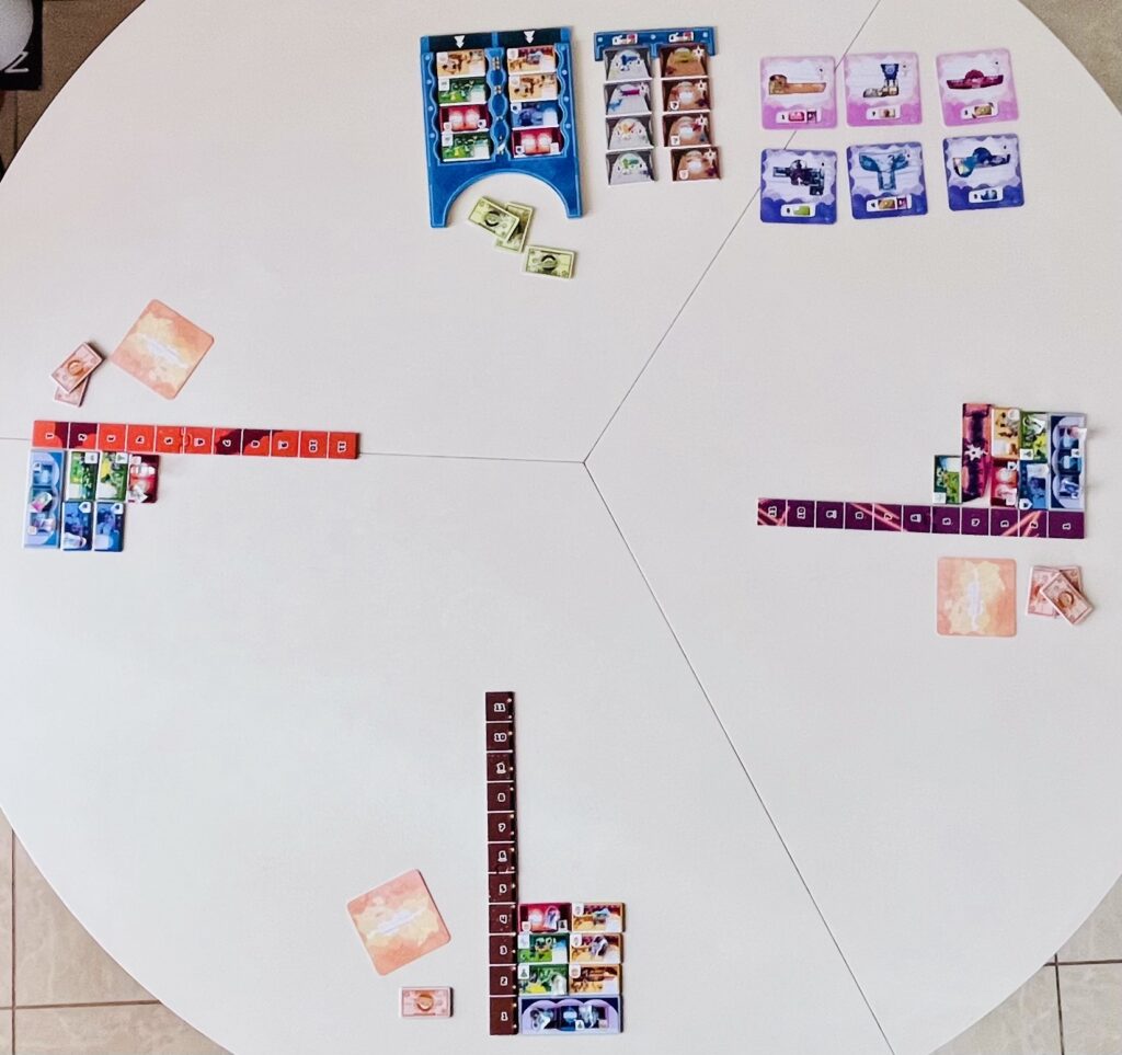 Superstore 3000 est assez classique dans sa mécanique. C’est un jeu de pose de tuiles qu’il faut bien agencer pour maximiser les points. Cependant, j’ai trouvé deux grands axes qui le différencient des autres titres. Tout d’abord, le scoring de fin de partie est assez dur car il n’y a que des majorités. Il faut donc constamment surveiller ses adversaires. Ensuite, les tuiles qui servent de constructions s’utilisent aussi comme moyen de paiement. Un support qui fait deux ressources, voilà qui est bien pratique !