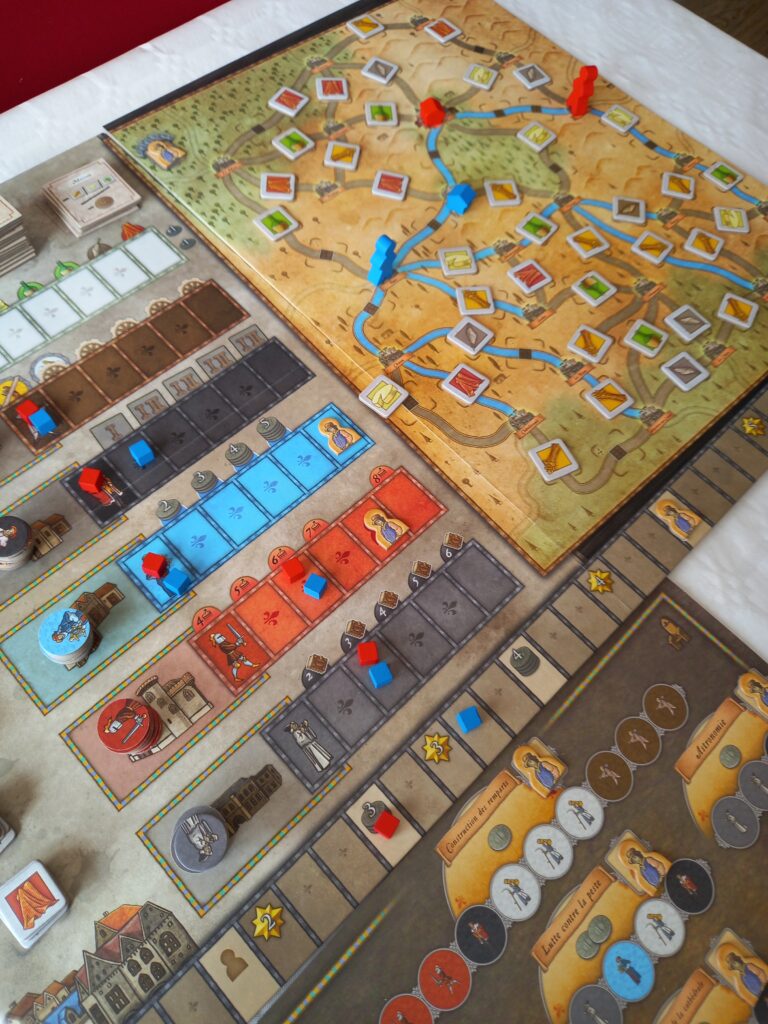 Dans Orléans, il va falloir gérer au mieux les jetons que vous allez mettre dans votre sac. Ne pas se surcharger d’un type de jetons en négligeant d’autres. Il y a pas mal d’interactions, d’abord sur le plateau terrain ou un seul joueur peut construire dans une ville et il y a la course aux villageois. Bag building, optimisation, course, vous comprenez pourquoi Orléans est un bon jeu.
