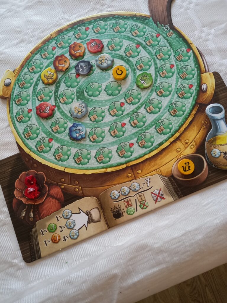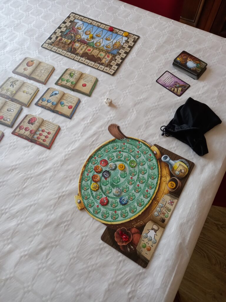 Lors d’une manche vous allez résoudre un événement de la pioche évènements. Alors commence la constitution de la potion. Chaque joueur joue simultanément et pioche un ingrédient dans son sac, par exemple un 3 blanc. Il le place alors à 3 espaces de la goutte. S’il avait tiré un deux blanc il l’aurait placé à 2 espaces de la goutte. Le joueur décide alors de continuer ou de s’arrêter de piocher dans le sac. Le chaudron explose une fois que le joueur a cumulé plus de 7 en jetons blancs. Par contre vider votre fiole vous permet de remettre un jeton blanc dans le sac.