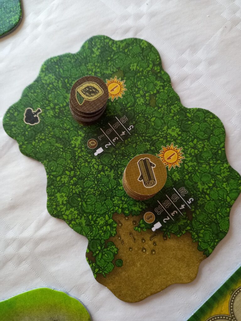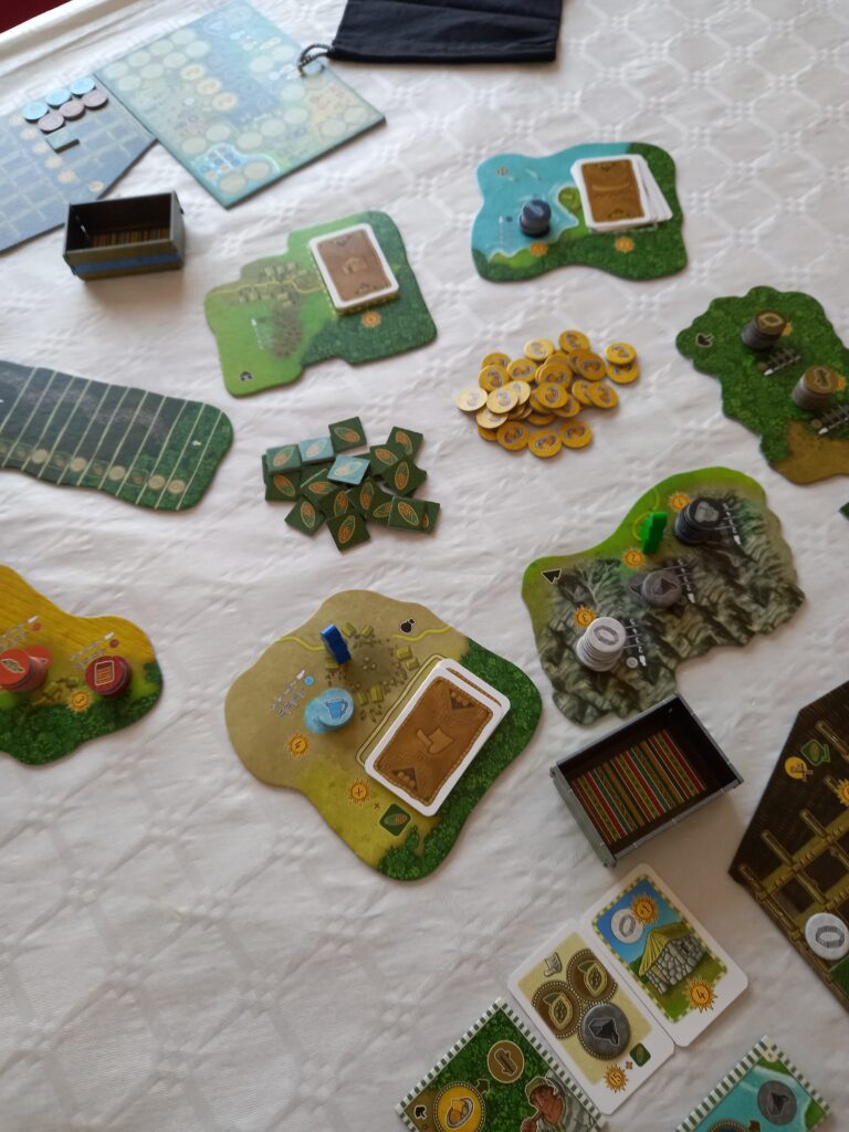 Les lieux permettent de récolter différentes ressources. La ferme permet de récolter les tuiles d’alpage, de laine et d’étoffe. La mine permet de récolter la pierre, le minerai et l’argent. Le forêt pour les tuiles bois et cacao. Le port permet de récolter du poisson et les cartes bateaux. Le marché vous permet d’acheter du verre et de recevoir des commandes. Au village, vous pourrez acheter des chariots et récolter des tuiles maisons qui augmentent de 1 la valeur de vos marchandises et enfin sur la route vous trouverez le maïs et vous pourrez augmenter le nombre de tuiles que vous pouvez tirer de votre sac. On commence avec 4.
