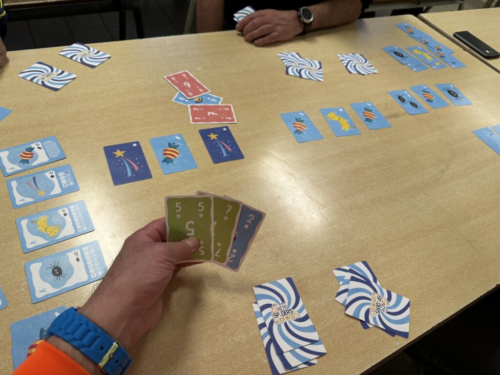 Le truc original c’est qu’il va falloir répartir ses cartes en 3 mains de 3 cartes. Il y a 9 cartes à gagner à chaque manche et ces cartes sont réparties en 3 groupes de 3. Les joueurs ont 9 cartes en mains qu’ils répartissent en 3 groupes de 3. Au début de la manche ils prennent leurs 3 premières cartes et joueront les 3 premiers plis avec ces 3 cartes, les 3 suivants avec leur second groupe de cartes,… Pour chaque groupe de cartes, Candy Spiders Leopards devint donc un jeu de plis avec très peu de cartes en jeu et donc une maitrise beaucoup plus difficile car il y aura beaucoup de renoms et donc de possibilités de couper et d’être coupé… Le jeu ressemble d’ailleurs plus à un jeu de programmation où, au début de chaque manche, les joueurs vont répartir leurs trios de cartes en fonction des cartes qu’ils voudront récupérer, plaçant leurs atouts dans le ou les trios qui les intéressent le plus. Reste plus qu’à espérer que d’autres joueurs ne visent pas les mêmes cartes…