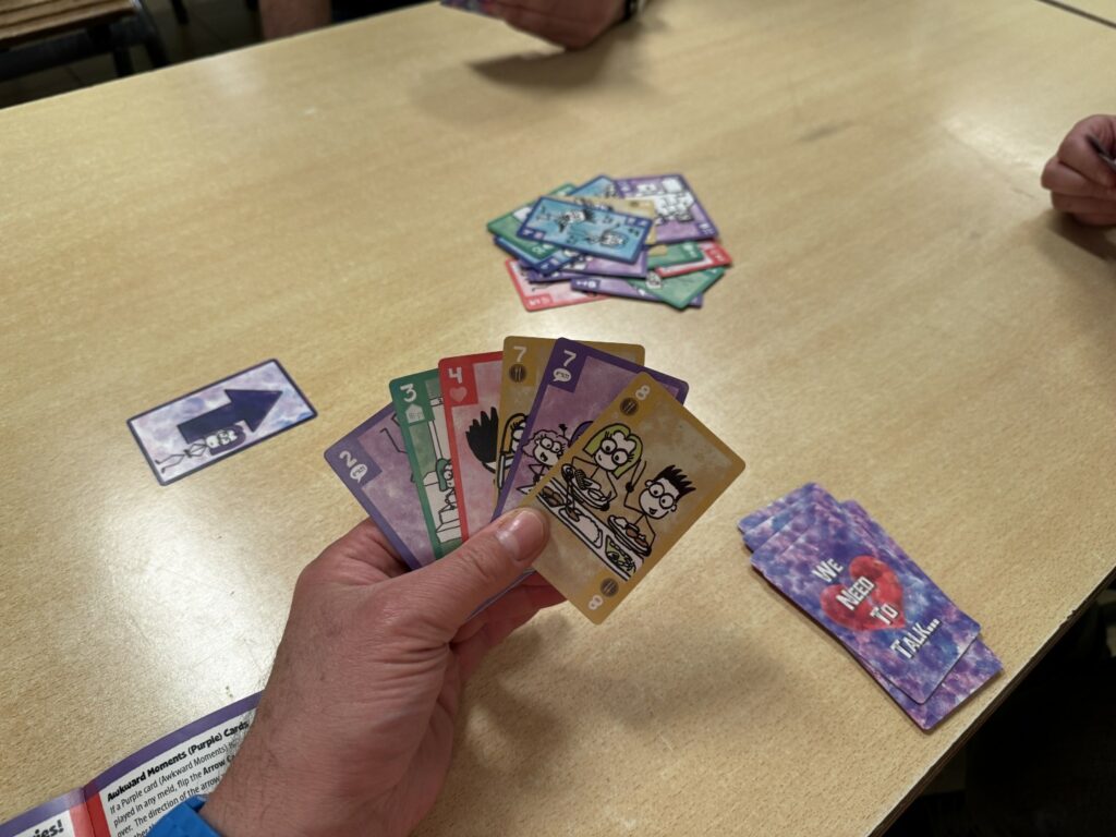 We Need To Talk est donc un jeu de plis & de défausse en même temps ce qui est assez unique et qui apporte l’originalité au jeu. Le jeu se joue en 2 parties, une première qui est un jeu de plis où les joueuses gardent toutes les cartes gagnées de leurs plis pour les jouer ensuite en défausse, le but étant la première à se débarrasser de toutes ses cartes.