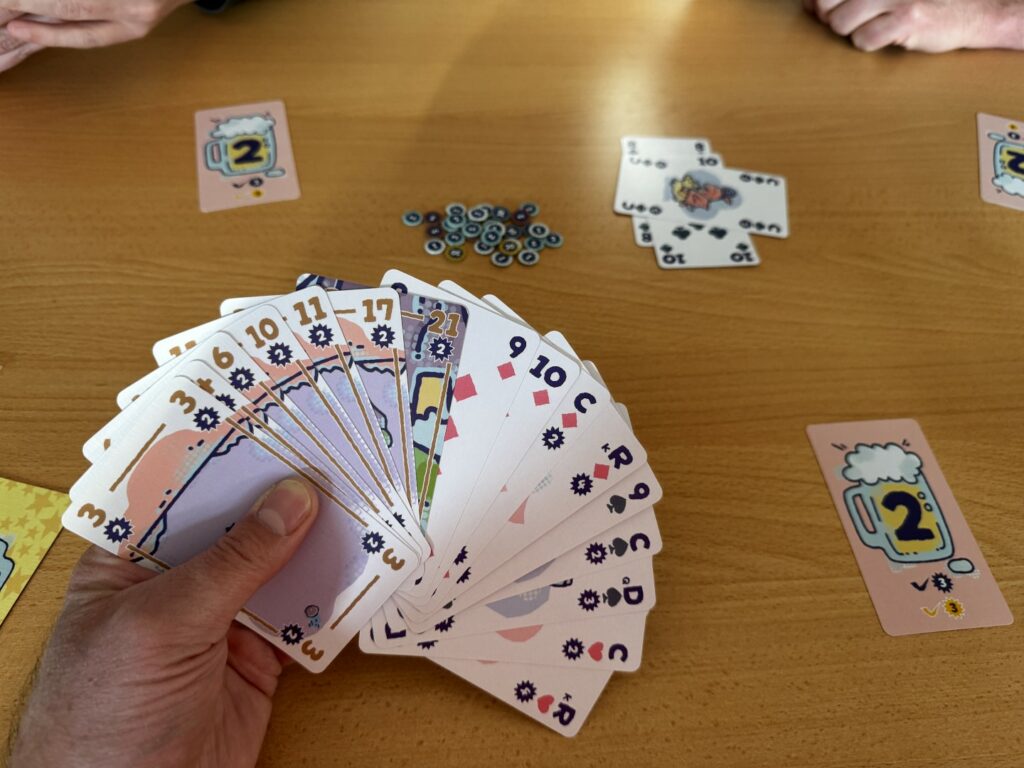 Dino Trix Hold My Beer, la version pour 3 joueuses, se base sur les règles du Tarot : must follow, must trump, et must over-trump. De nombreuses cartes rapportent des points : chaque atout rapporte 2 points, l’excuse rapporte « -2 » points, les Rois 4, Dames 3, Cavaliers 2 et Valets 1. L’objectif est de bien miser sur sa place en points. Serai-je 1er avec le plus de points, second ou 3ème avec le moins de points ? Si je parie sur 1er et que je réussis, je gagne 1 PV, second 3 PVs et dernier 1 PV !!! On aura alors toutes tendance à viser d’être seconde. Mais une seule réussira et gagnera 1 PV par autre joueuse ayant parié la même position et raté son pari. Mieux vaut alors quelques fois se contenter d’un seul PV tu l’as que 3 tu l’auras pas 😉