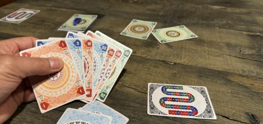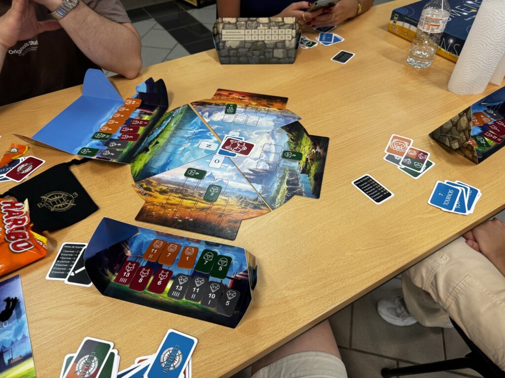 Côté matériel, c’est plus une question de goût. L’éditrice a fait le choix de remplacer les cartes par des tuiles en carton. Personnellement, j’ai un peu de mal avec ça. J’aime un jeu de cartes qui se joue avec des cartes! Les tuiles ont néanmoins l’avantage de se mélanger plus facilement dans un sac opaque. Le jeu fournit également des cartes enchères qui aident à la compréhension sur ce qu’on peut annoncer ou pas. Il y a aussi une aide de jeu sur les points à gagner et un tableau sur les paravents permettant d’estimer le nombre de plis qu’on est capable de faire.