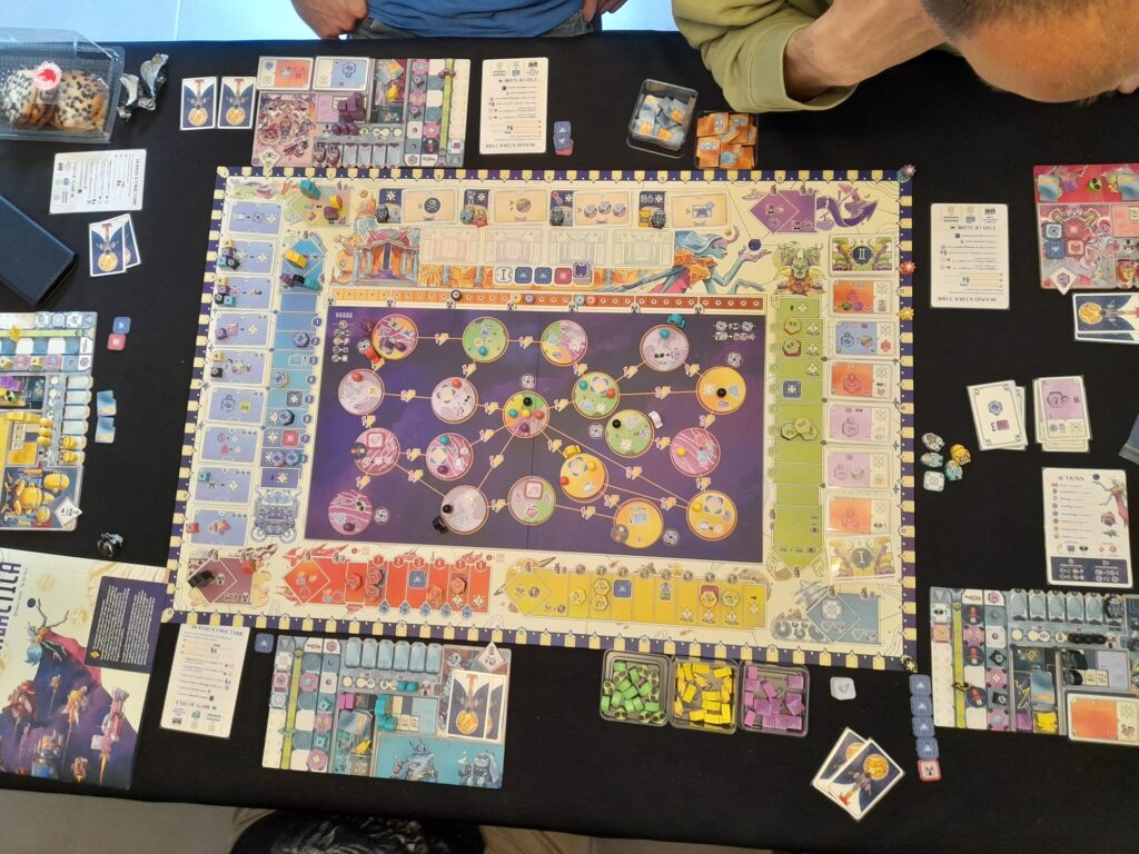 La première chose à dire au sujet de Transgalactica, c’est que cet Eurogame risque, selon moi, de diviser fortement. D’abord à cause de son design, pour le moins flashy et un brin déroutant, qui ne fera clairement pas l’unanimité. Ensuite, il faut reconnaître que son auteur, Daniele Tascini, figure bien connue du monde ludique, reste un personnage controversé — non pas pour ses créations, toujours saluées, mais pour certains de ses propos passés…Mais le point le plus problématique reste sans doute son livret de règles, qui, disons-le franchement, est un échec complet. Et pour un Eurogame du calibre de Transgalactica, cela constitue un vrai handicap. Face aux critiques légitimes des joueurs, un second livret de règles a heureusement vu le jour en ligne, suivi d’une FAQ indispensable pour lever les dernières zones d’ombre… Cela dit, pour certains, cette entrée en matière laborieuse sera tout simplement rédhibitoire, et on ne peut guère leur en vouloir.C’est d’autant plus regrettable que derrière cette couche de frustration initiale, Transgalactica révèle un jeu d’une richesse remarquable. On y retrouve toute la saveur des « T games », comprenant des titres majeurs comme Tzolk’in, Marco Polo, Teotihuacan, Trismegistus, Tekhenu, Tabannusi ou encore Tiletum. Bref, si l’on prend le temps de dépasser les obstacles initiaux, Transgalactica s’impose comme un excellent Eurogame, malheureusement desservi par des choix éditoriaux discutables.