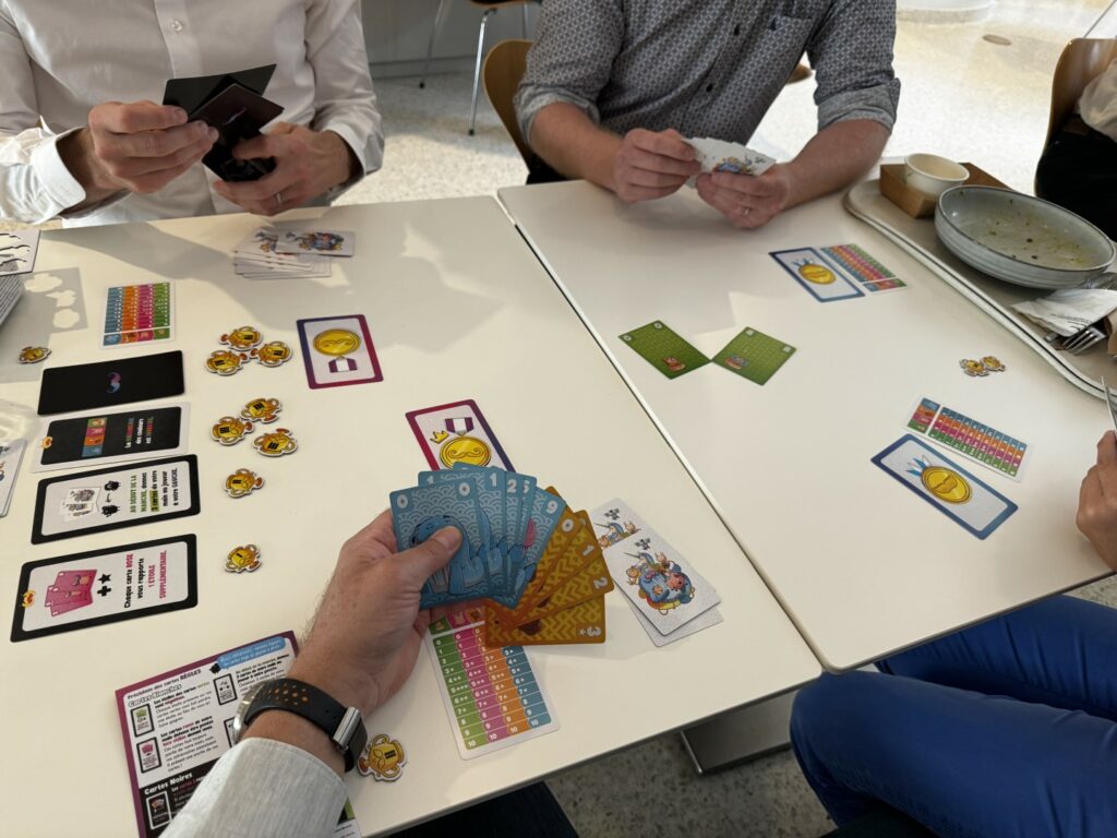 Mais l’originalité de Moustache ne s’arrête pas là. Il se joue en équipe et les équipes sont constituées au hasard à chaque manche. Il n’est néanmoins pas toujours facile d’optimiser son jeu en fonction de son coéquipier mais ça arrive 😉 De plus, à chacune des 4 manches, on vient ajouter une « loi » qui va changer les règles du jeu comme, par exemple, les cartes roses qui rapportent 1 point de plus, ou, au début de chaque manche, on doit donner 3 cartes à son voisin de gauche, ou, on inverse l’ordre des couleurs, ou, chaque couleur jouée devient la couleur demandée.