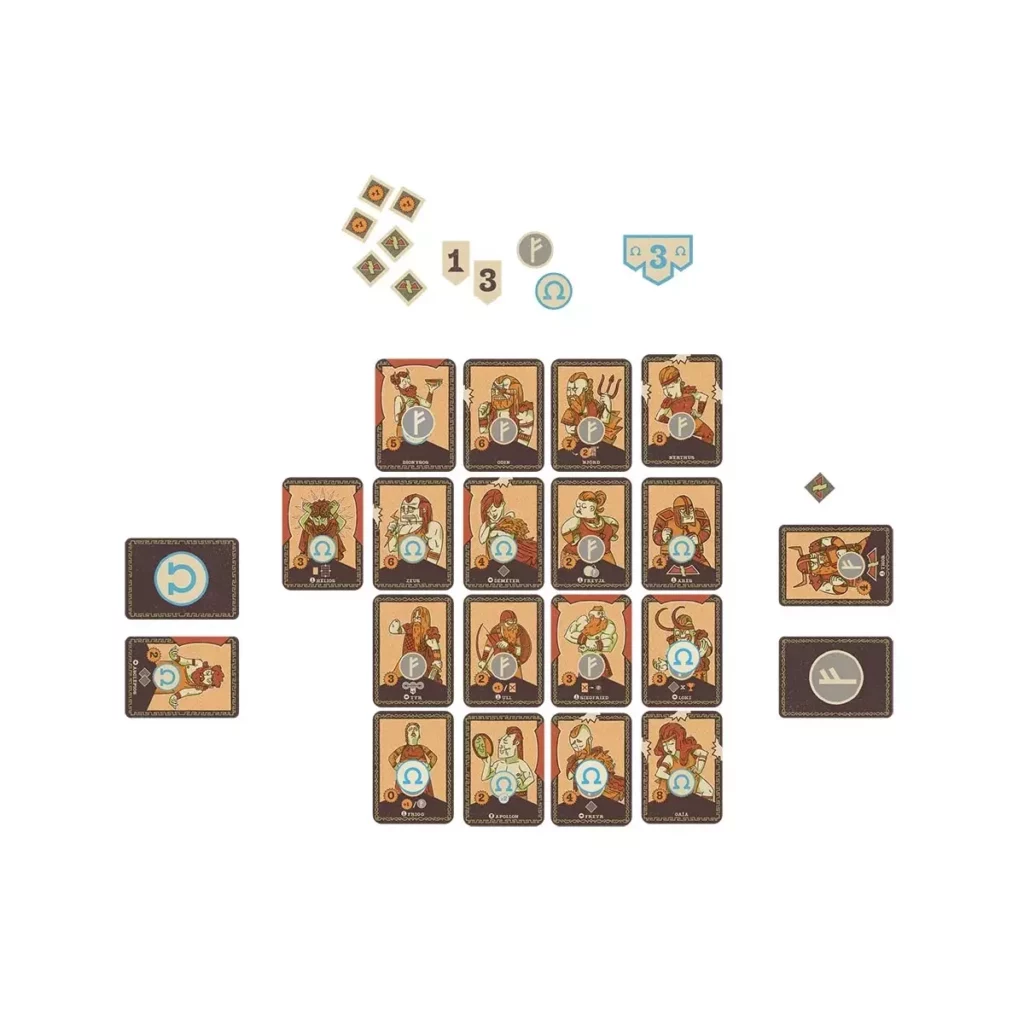 Dans Mythic Arena, les dieux grec Zeus et nordique Odin s’affrontent pour conquérir le territoire, c’est-à-dire la zone de jeu. Au début de la partie, donnez un deck grec ou nordique à chaque joueur. Les deck sont symétriques et composés de 17 cartes Placez les pions allégeance, les points de victoire et les pions puissance au centre de la table.