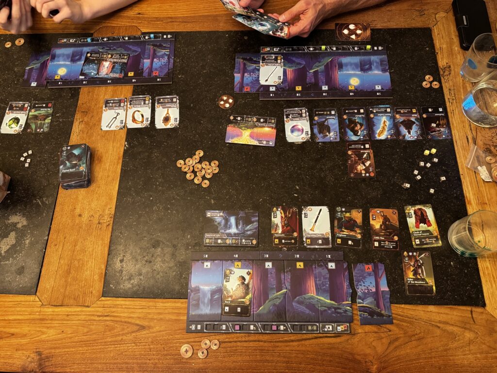 La seconde est la phase d’action. Chaque joueuse, à son tour, va réaliser une action puis une seconde quand revient son tour et la phase d’action se termine là. Il n’y a que 4 actions possibles: piocher 2 cartes, jouer une carte en la plaçant sur le bon emplacement de la ligne du temps et en se défaussant du nombre de cartes demandé, déplacer 2 cartes d’un cran (ou une de deux crans) sur la piste du temps ou prendre le contrôle d’une source en les attaquant avec des unités dont la somme des puissances est suffisante. A chaque mise-en-place d’Echoes of Time, on dispose autant de cartes source que de joueuses. Les joueuses vont se disputer le contrôle de ces cartes source car elles apportent effet immédiat et long terme intéressants comme des réductions permanentes pour jouer les cartes, l’obligation aux adversaires de se défausser de cartes, le pouvoir de jouer une carte sans coût de temps en temps,…
