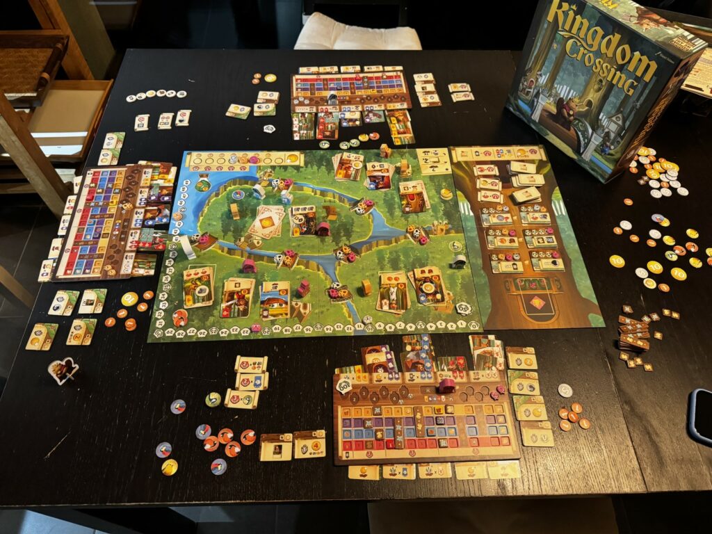Un eurogame bien complet donc. Même si on peut construire une certaine asymétrie en améliorant certaines de ses actions ou en gagnant des revenus différents, il lui manque des capacités asymétriques plus marquées pour en faire un eurogame plus expert. Il y a peu de construction de moteur dans le jeu, et un léger sentiment de répétitivité peut apparaître même si le jeu tourne vite. Le hasard est présent dans l’apparition des cartes et il n’est pas rare de voir un joueur pester s’il ne trouve pas la couleur de carte qu’il recherche parmi celles disponibles (pas de refresh possible). Le thème loufoque des ponts à ne traverser qu’une fois est bien ancré dans les mécaniques et c’est clairement ce qui distingue Kingdom Crossing des autres eurogames poids moyen. Le jeu est un vrai casse-tête à chaque manche où les joueurs vont devoir optimiser leurs déplacements pour pouvoir se déplacer un maximum de fois tout en s’arrêtant dans les îles qui correspondent à leur stratégie et avant que les adversaires ne leur prennent les cartes qu’ils visent. Il y a en soi 4 grandes stratégies dans le jeu, chacune correspondant à une ressource à optimiser même si « un peu de tout » peut marcher également. Kingdom Crossing est un jeu « expert-leger » qui est très plaisant à jouer et dont on a envie de refaire plusieurs parties pour s’améliorer.