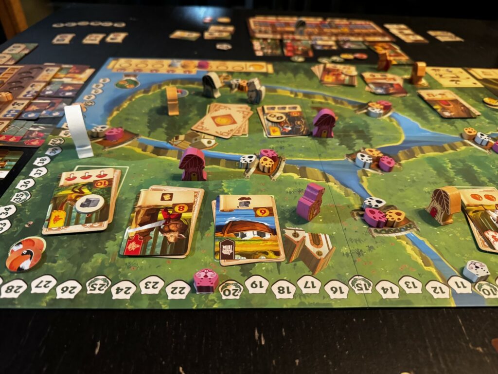Dans Kingdom Crossing, on va donc accumuler les ressources sans les dépenser pour optimiser les PVs qu’ils génèrent en association aux cartes que vous aurez acquises. Vous allez également améliorer vos tuiles action pour gagner de meilleurs bonus quand vous les utilisez et acquérir des cartes revenus qui, non seulement vous apporteront des revenus à chaque tour mais vous feront gagner des PVs. Vous devrez également viser d’atteindre, avant vos adversaires, quelques objectifs communs et acquérir des contrats privés qui vous feront gagner des PVs supplémentaires.
