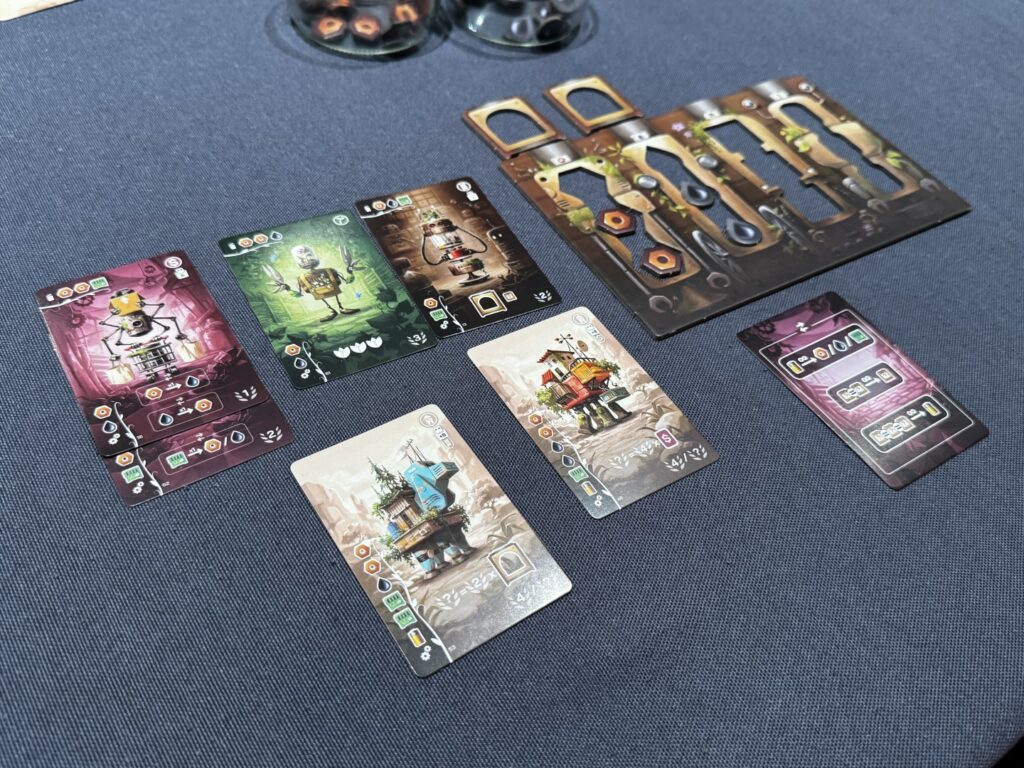 Et le génie ne s’arrête pas là puisque ce qu’on va faire avec la carte n’est pas triste non plus 🙂 On a 3 choix simples: soit on répare le droïde en payant les ressources nécessaires et on le pose devant soi pour bénéficier de ses effets, soit on le recycle pour gagner ses ressources, soit on le défausse pour construire une des cartes maison situées entre les joueurs et rapportant, chacune, des PVs d’une façon conditionnelle unique. Les effets des cartes sont assez simples. Elles font gagner des PVs, des ressources, des extensions d’entrepôt ou des feuilles qui servent à gagner des PVs et des ressources.
