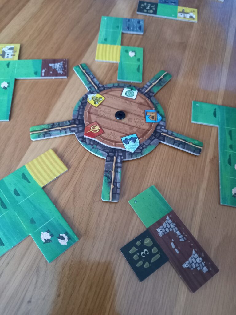 Par contre la sélection des tuiles ne se fait pas comme décrit dans l’article. Le premier joueur ne choisit pas une tuile de son choix, mais fait tourner la roue et choisit parmi les deux tuiles désignées par son blason, comme les autres joueurs.