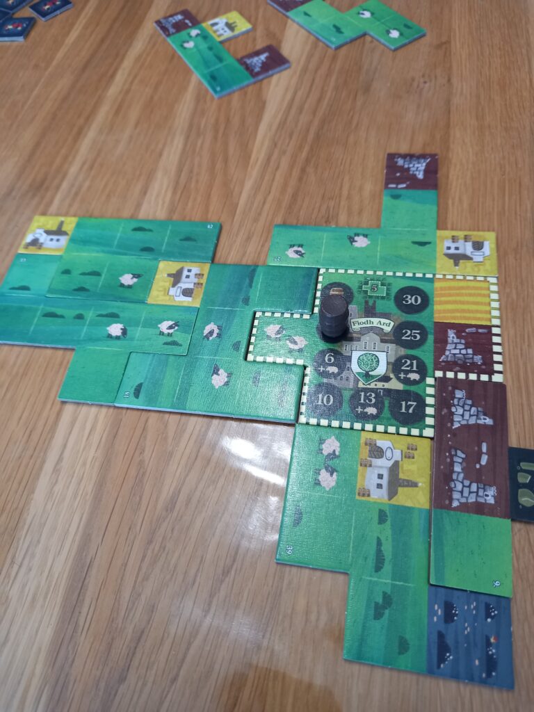 En fin de partie vous scorez 5 points additionnels si votre domaine de départ est entièrement entouré de tuiles. Vous allez également compter le rectangle le plus grand autour de votre domaine en multipliant les cases verticales aux cases horizontales. C’est la que les tours sont utiles pour boucher les trous. Reste à compter le pâturage avec le plus de moutons, la piste whiskey et voilà.
